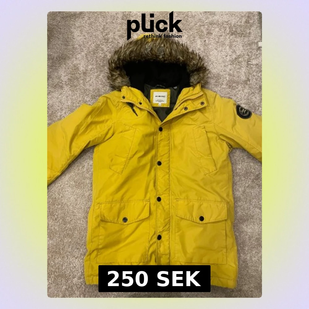 Gul parkasjacka från Jack & Jones med fuskpäls på huvan, svarta knappar och patch på ärmen. Jackan har flera fickor framtill, snörning vid huvan och ribbade muddar. Några sönderrivna delar, men det påverkar inte förmågan att hålla dig varm.