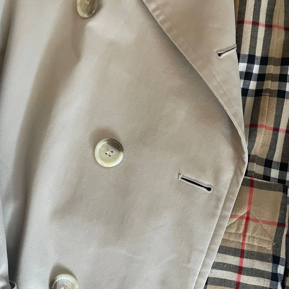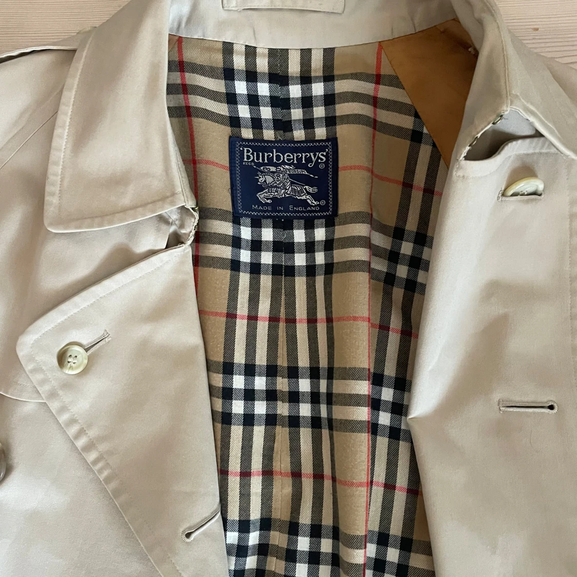 Säljer en klassisk beige trenchcoat från Burberrys. Den har ett ikoniskt rutigt mönster på insidan och är utrustad med knappar och ett bälte vid ärmsluten. Perfekt för höst och vår! Storlek M