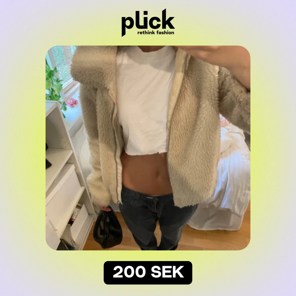 En beige, vit Teddy jacka. Storlek M men som ni ser på bilden lite mer utav storlek S❤️