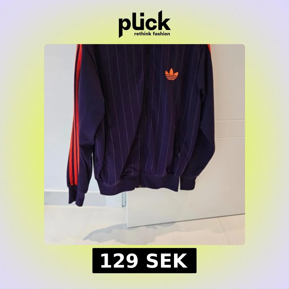 Säljer en snygg lila träningsjacka från Adidas med orangea ränder och logga. Jackan har dragkedja och långa ärmar, samt ett diskret randigt mönster. Perfekt för en sportig look!