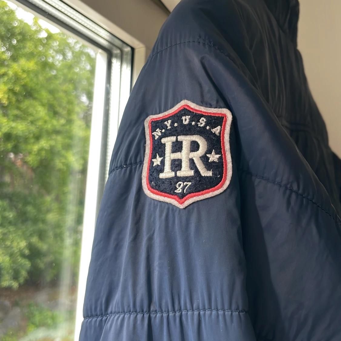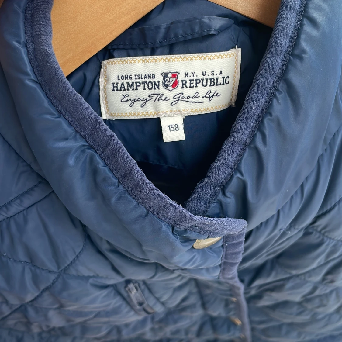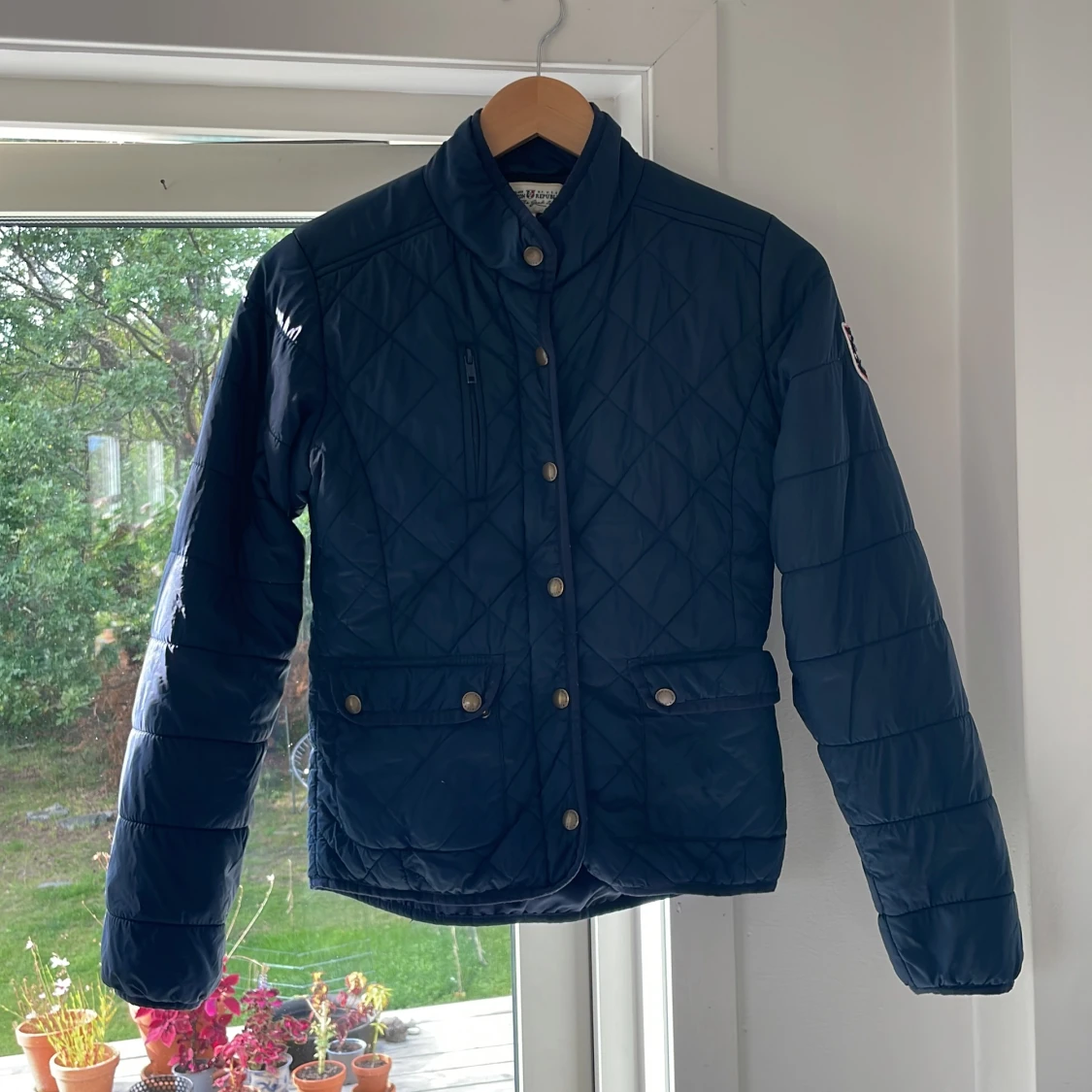 Marinblå jacka, toppen till hösten och våren, skönt material och sitter snyggt på. Barnjacka.