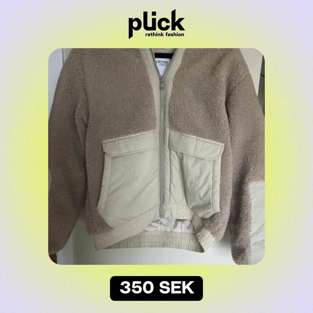 Beige teddyjacka. Endast använd ett fåtal gånger. Riktig ficka åt sidan, inte riktig ficka upptill. Innerficka finns. Köparen står för frakt