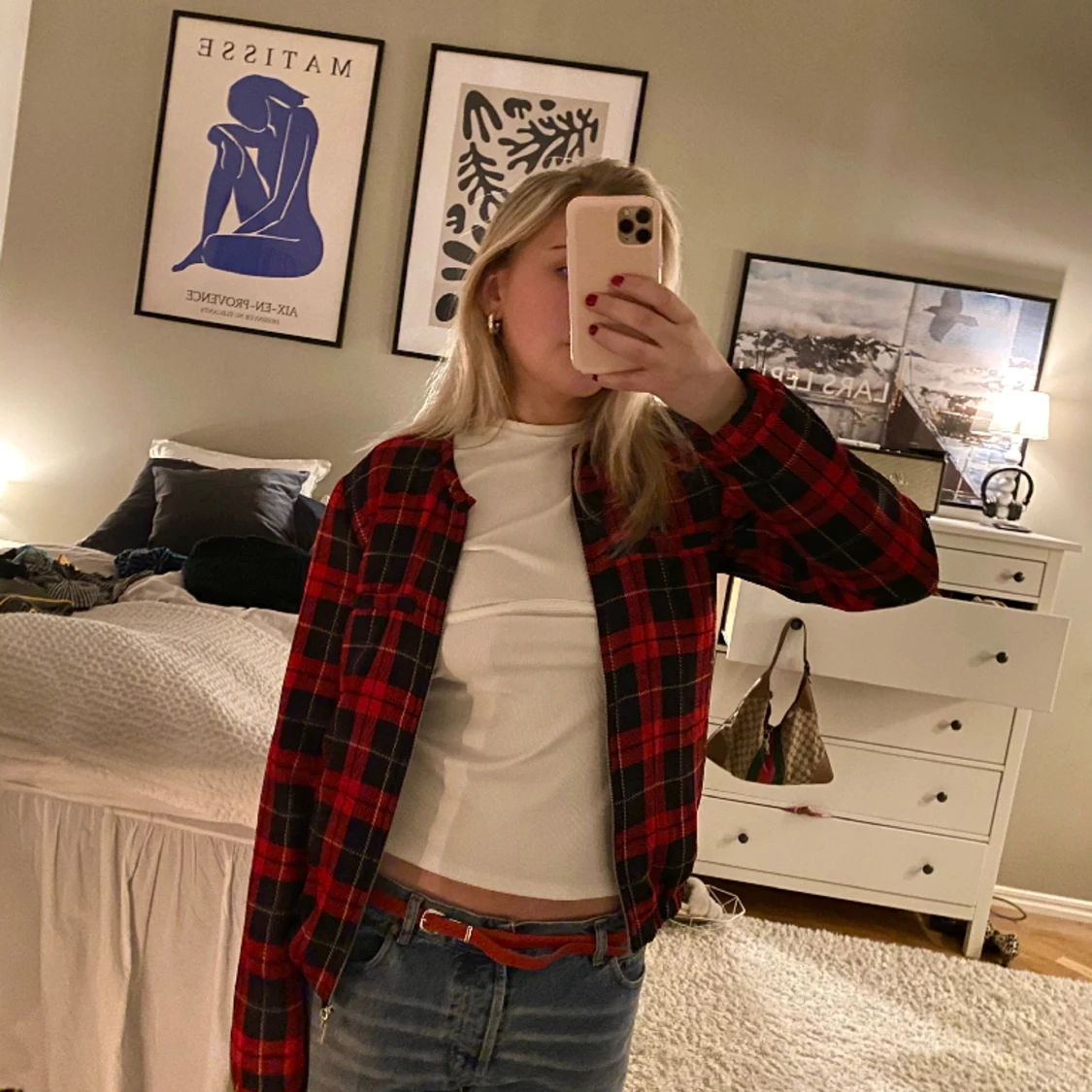 Aldrig använt. Jättebra skick. Rutig röd bomberjacka. Cool unik, sitter jättesnyggt o najs material lite fodrad