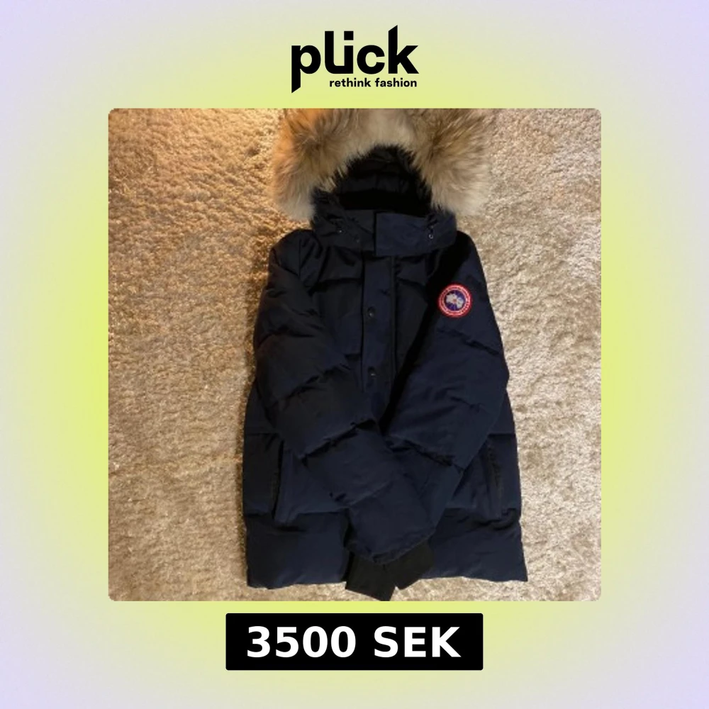 Säljer en mörkblå Canada Goose dunjacka med stor fluffig pälskantad huva och klassisk logga på ärmen. Jackan har dragkedja och knappar framtill, två stora fickor och ribbade muddar vid ärmsluten. Perfekt för kalla vinterdagar. Väldigt varm och vattentät.