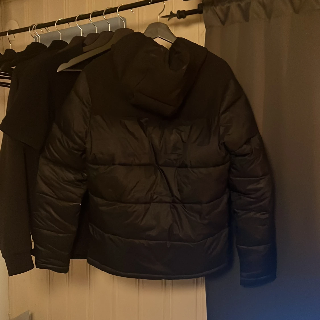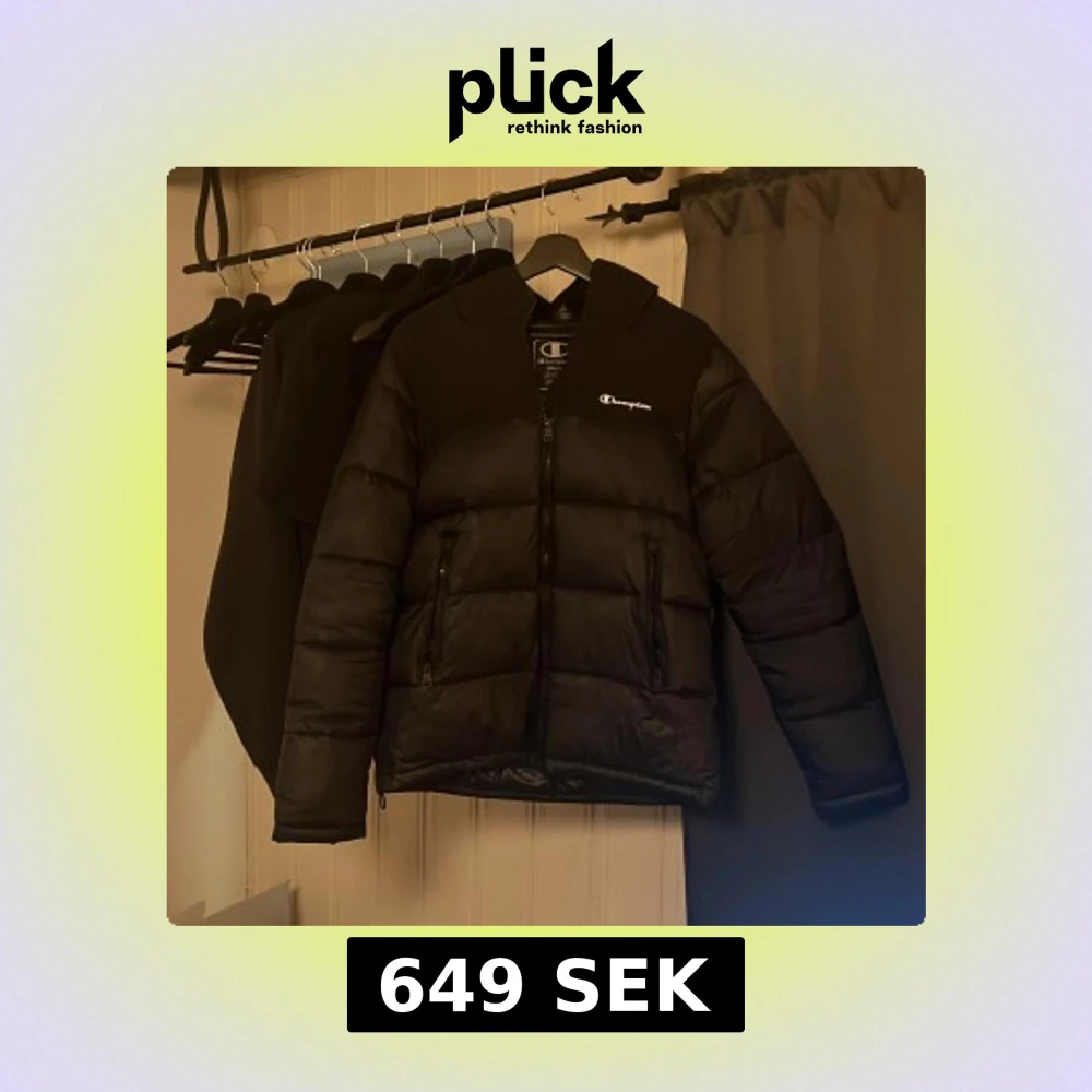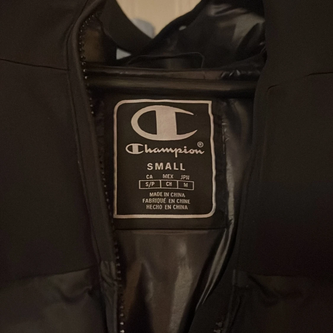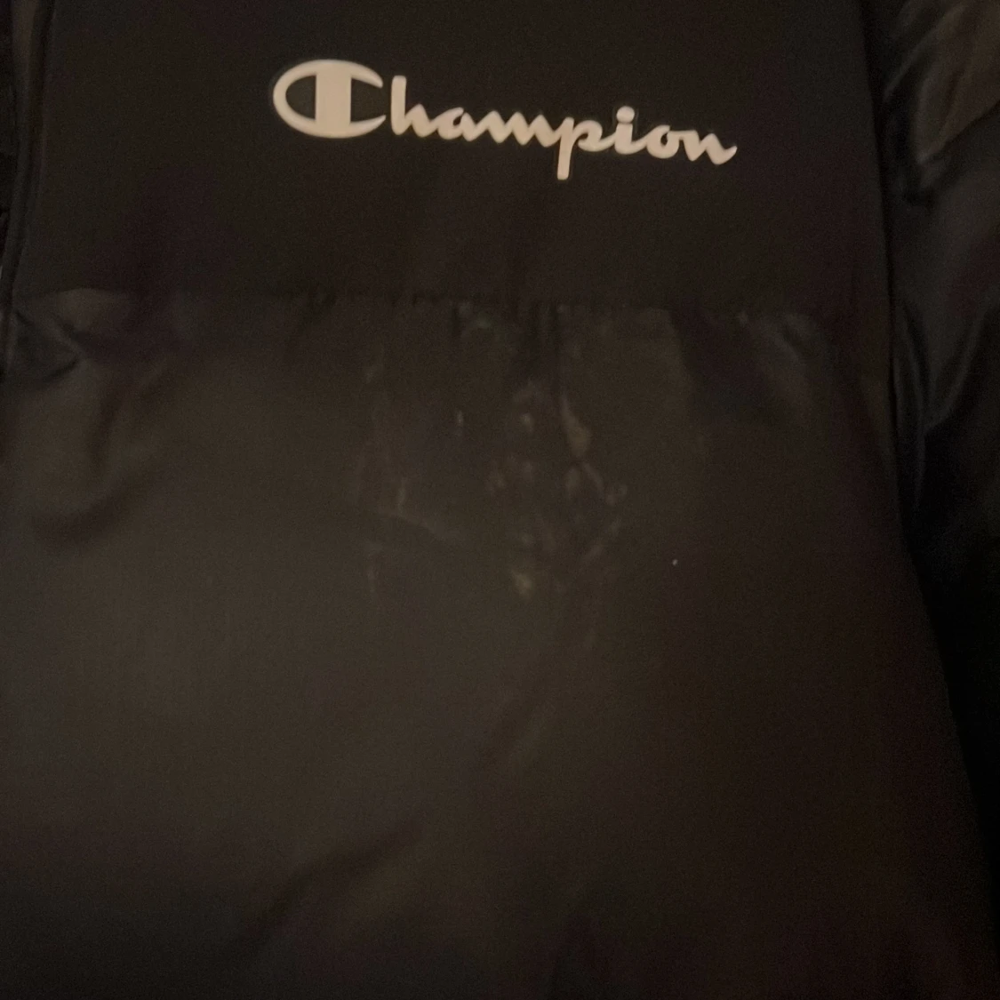 Säljer en svart dunjacka från Champion med dragkedja och huva. Jackan har en stilren design med Champion-loggan på bröstet. Perfekt för kyligare dagar. Lite fläckar på bröstet under loggan