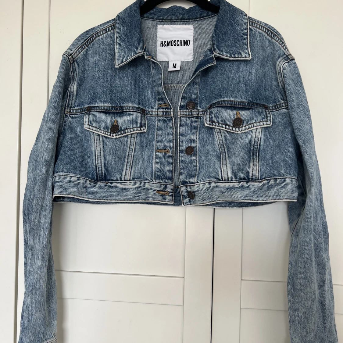 En äkta Moschino denim jacka som är cropped och utsmyckad på baksidan. Jättefin färg och passar till mycket. Använd endast 1 gång en kort stund, så den är så gott som ny i perfekt skick. Sista bilden är lånad.
