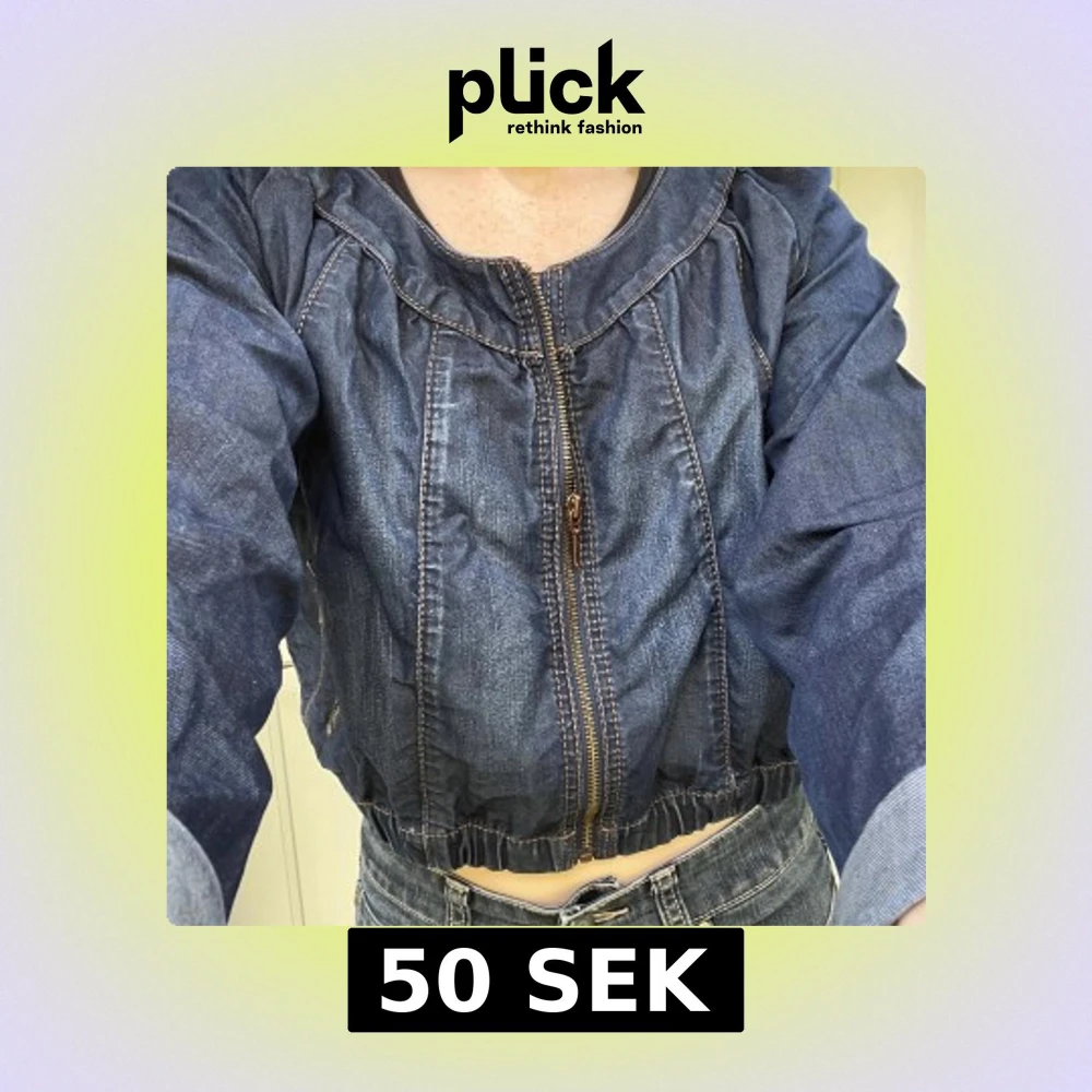 Säljer en mörkblå croppad jeansjacka med dragkedja framtill och elastisk midja. Jackan har långa ärmar, markerade sömmar och fickor på vardera sida. Storleken är large men funkar bra för en oversized look om man är storlek small som jag också.
