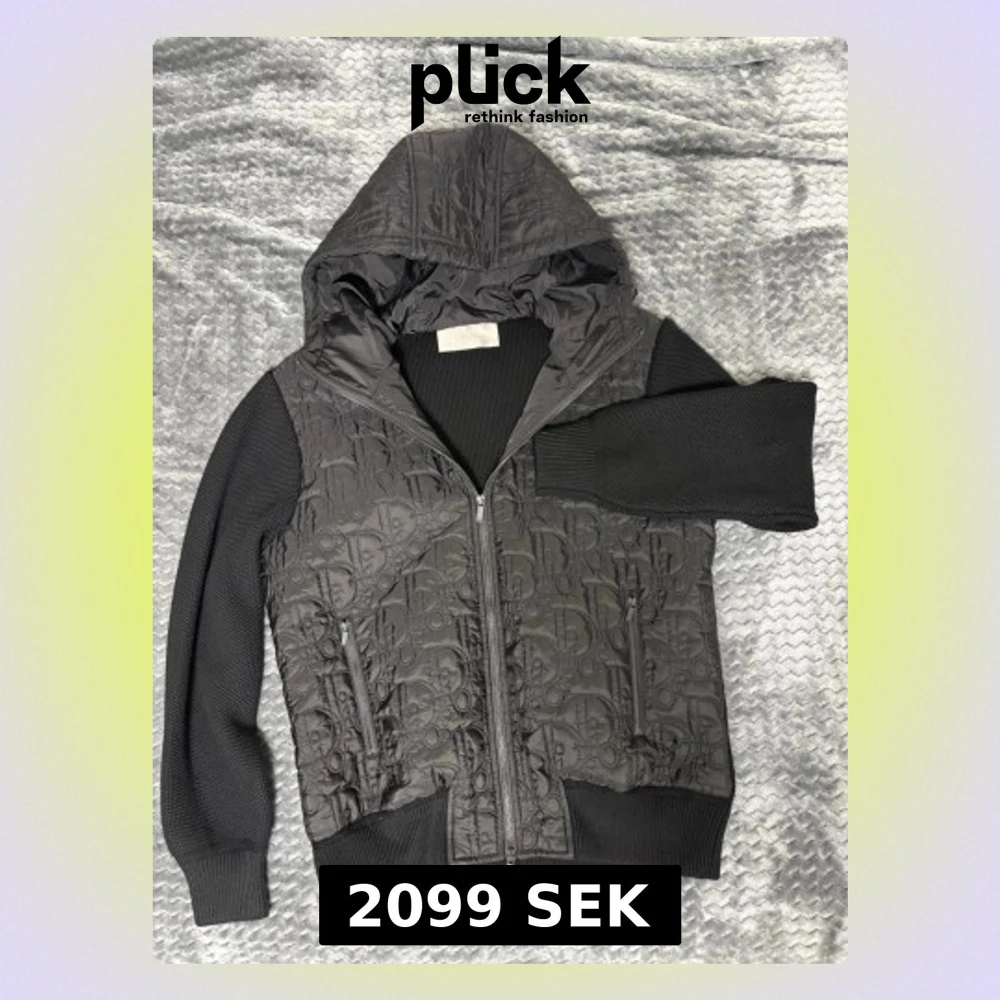 (Pris går att diskutera) Svart hoodiejacka från Dior med quiltad framsida och huva i glansigt material med Dior-mönster. Ärmar och rygg är stickade och ger en schysst kontrast. Jackan har två dragkedjefickor och ribbade muddar. Perfekt för dig som vill ha en unik och lyxig streetstil.