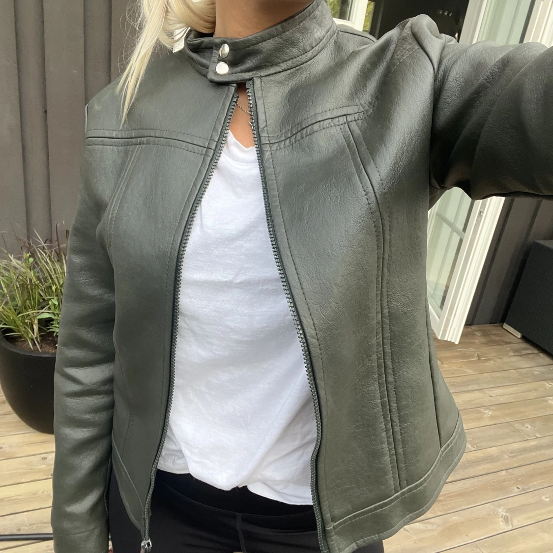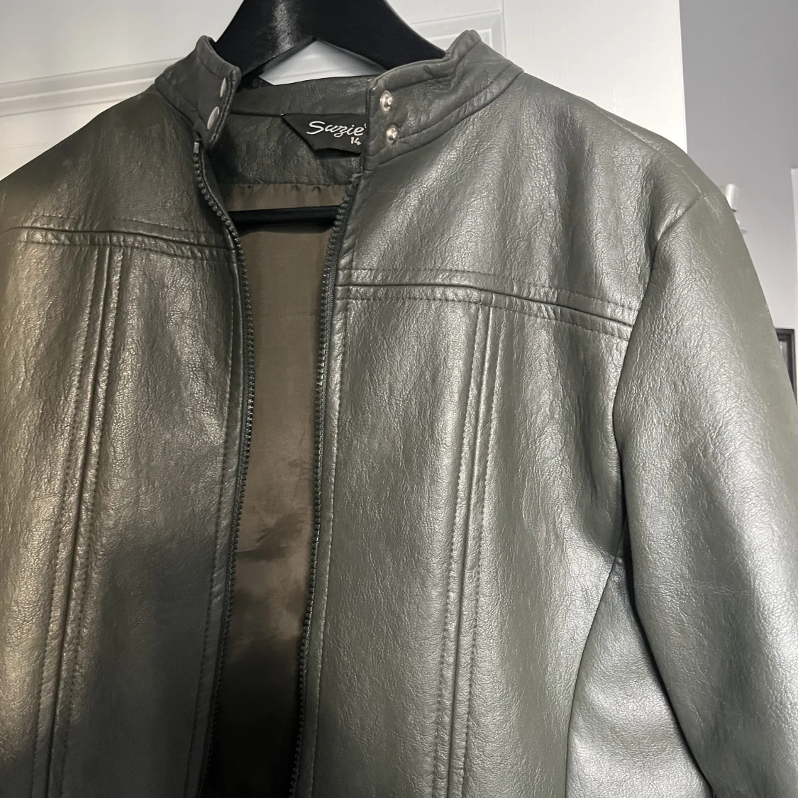 Mörkgrön nästan svart/grå jacka i skinnimitation. Spänne vid halsen och dragkedja. Jackan har ingen storlek men skulle säga att den passar S/M beroende på hur man vill att den sitter! Bra skick men en liten reva på ryggen.