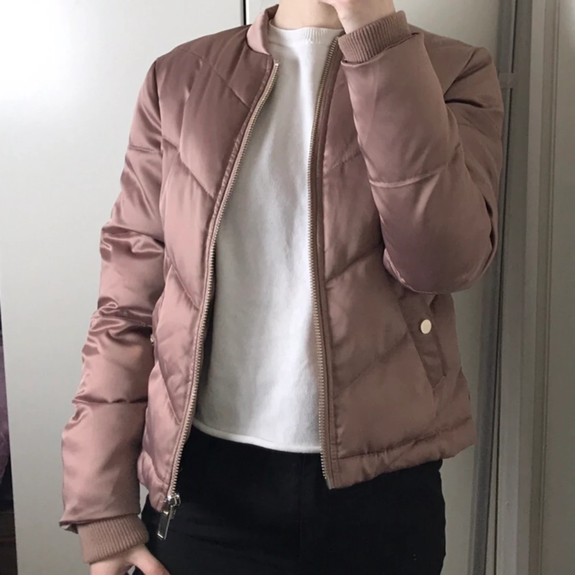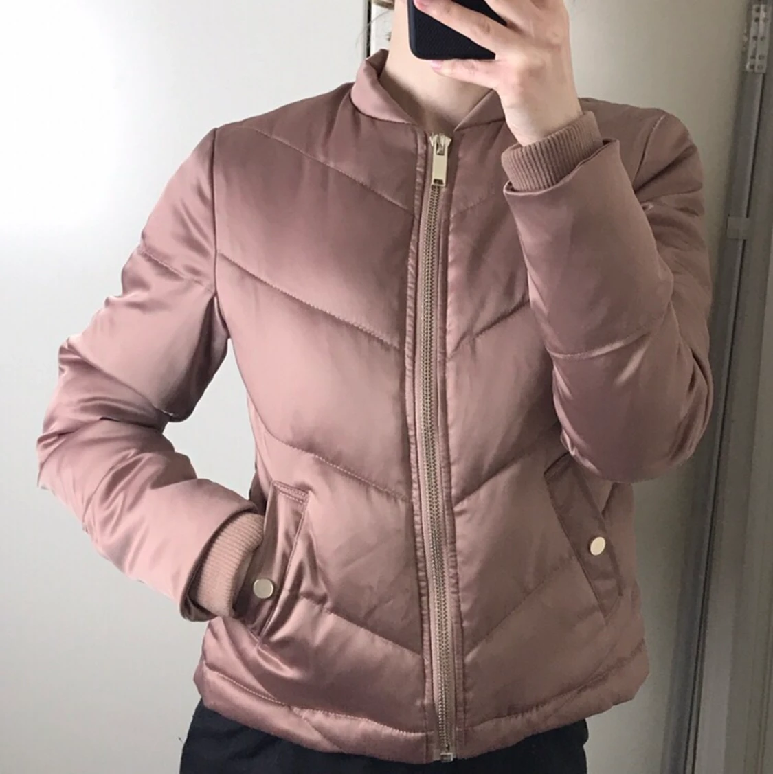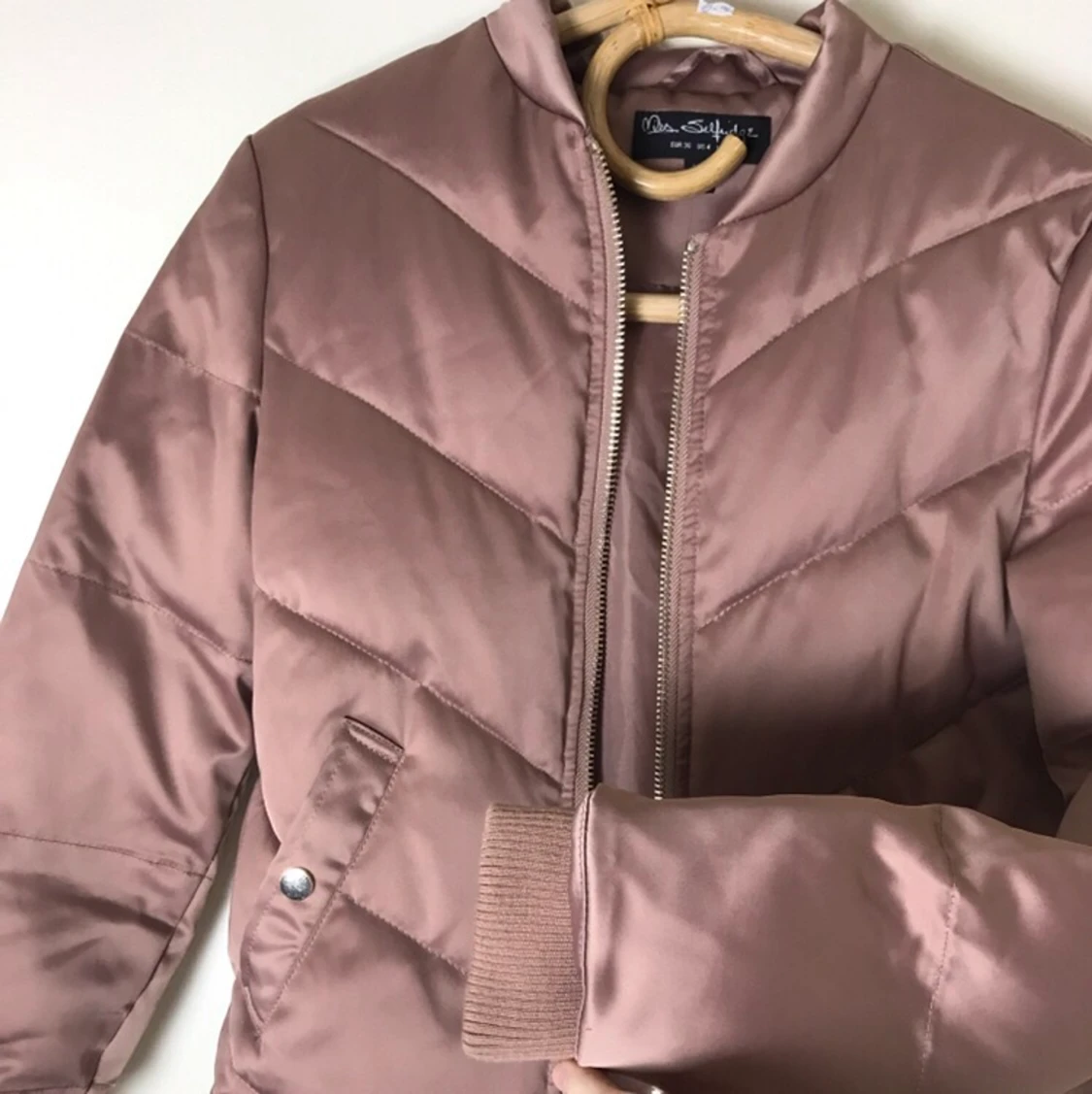 Jackan har en färg som jag skulle kalla en blandning mellan puderrosa och mauve, och tyget är något glansigt. Storleken är 36, jag brukar normalt ha 34/36. Säljer den då det visar sig att jag sällan använder kläder i rosa/rosaliknande färger. Jag tycker dock att den är jättefin och eftersom jag knappt använt den är den i väldigt bra skick.