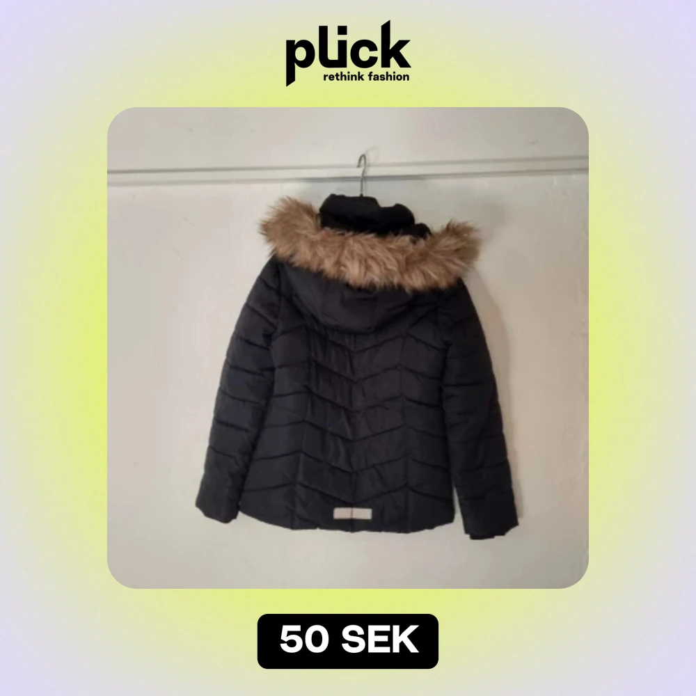 Jackan är svart med en guld kedja, och päls på luvan. Luvan går att att av och sätta på med hjälp av knappar med ena knappen är sönder, annars är jackan i bra skick. Säljs för att den blivit liten