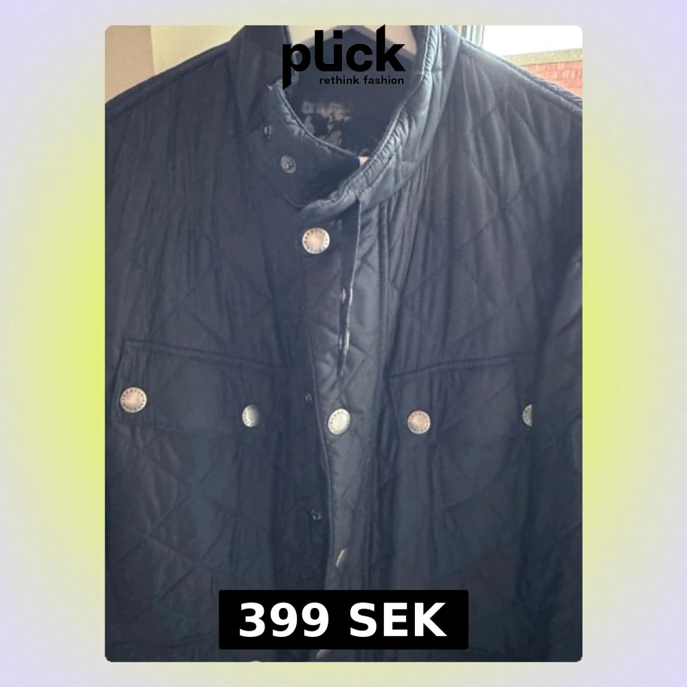 Quiltad mörkblå jacka från Barbour i storlek M. Klassisk look med tryckknappar, ståkrage och två stora fickor framtill. Jackan har Barbour-logga på armen och är tillverkad i lätt polyester, perfekt för höst och vår.