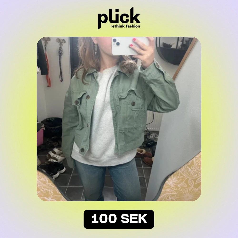 Jättefin grön jacka från pull&bear. Använd ett fåtal gånger så i bra skick. Storlek M men jackan är lite mer åt det croppade hålet.