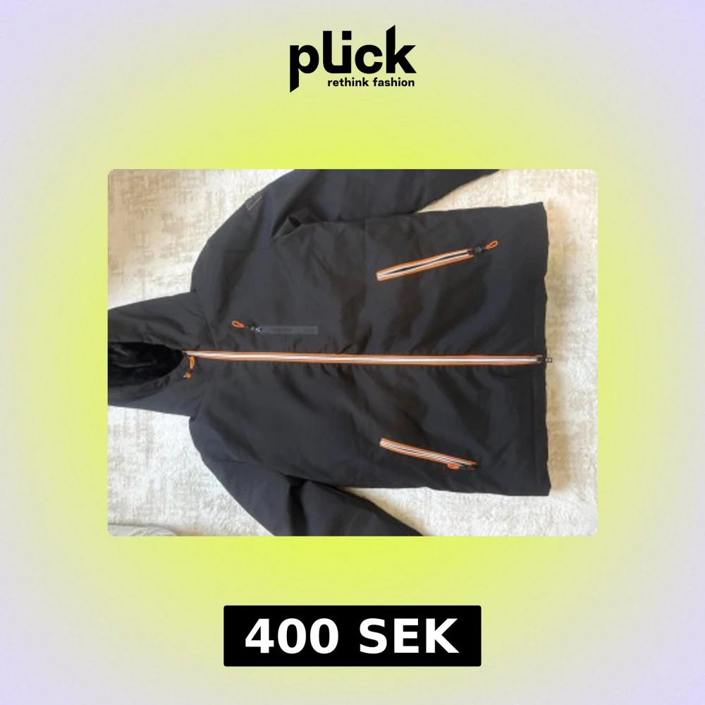 Svart dunjacka från GeoNorway med huva och orange detaljer på dragkedjorna. Jackan har tre fickor med dragkedja och ett snyggt märke på ärmen. Insidan är quiltad och fodrad med mjuk svart päls i huvan. Perfekt för kalla dagar. Priset kan diskuteras.