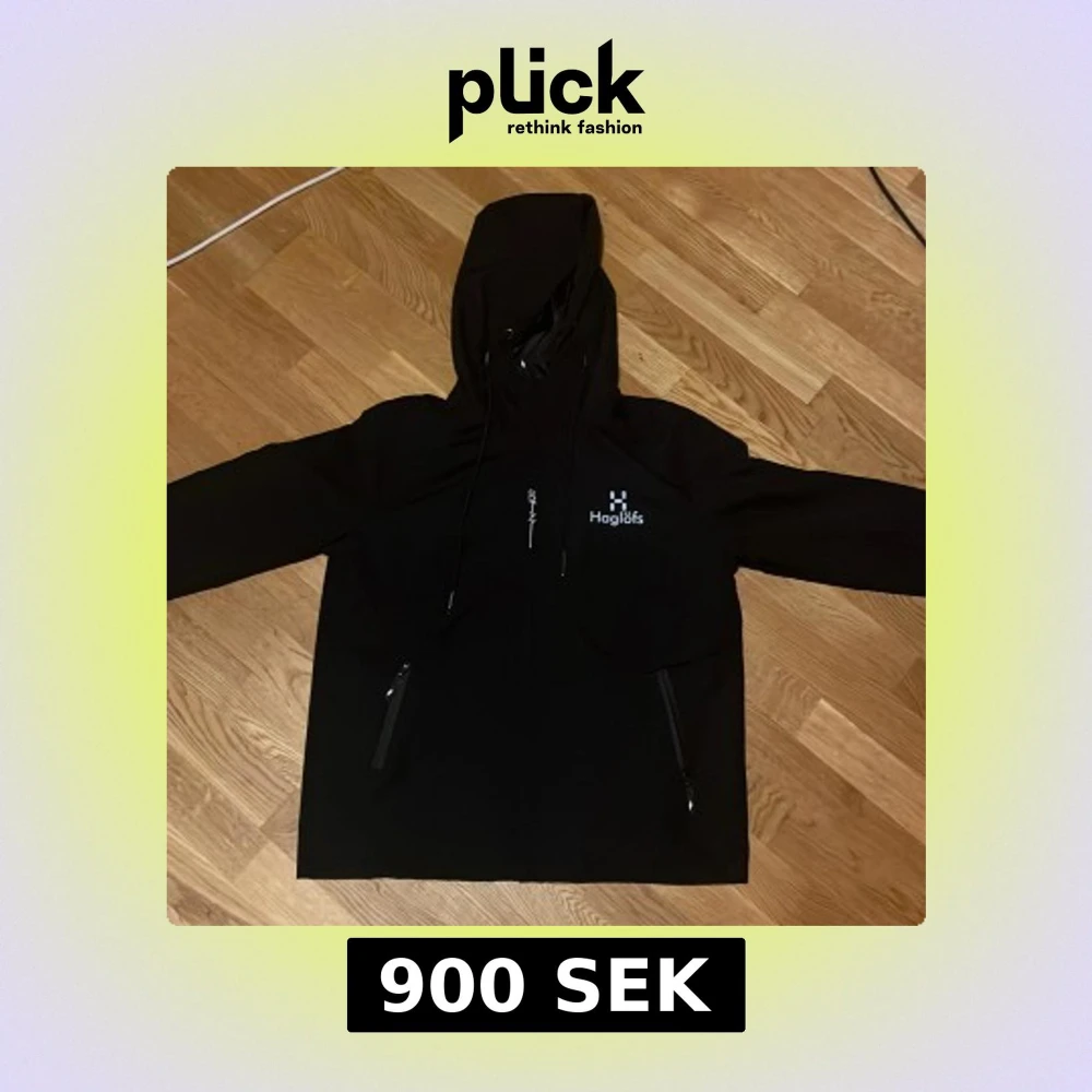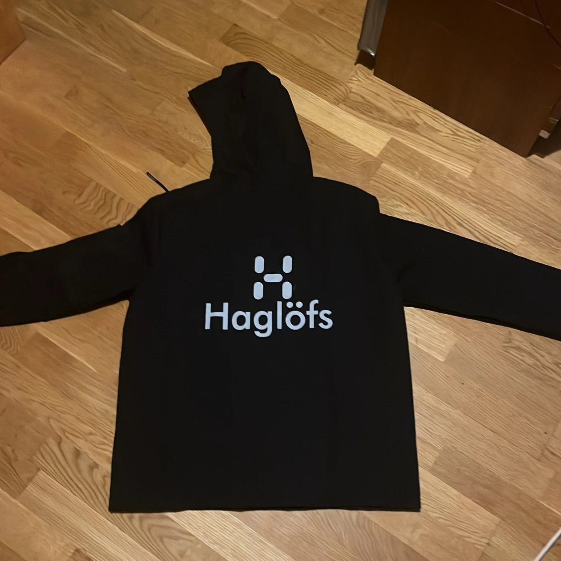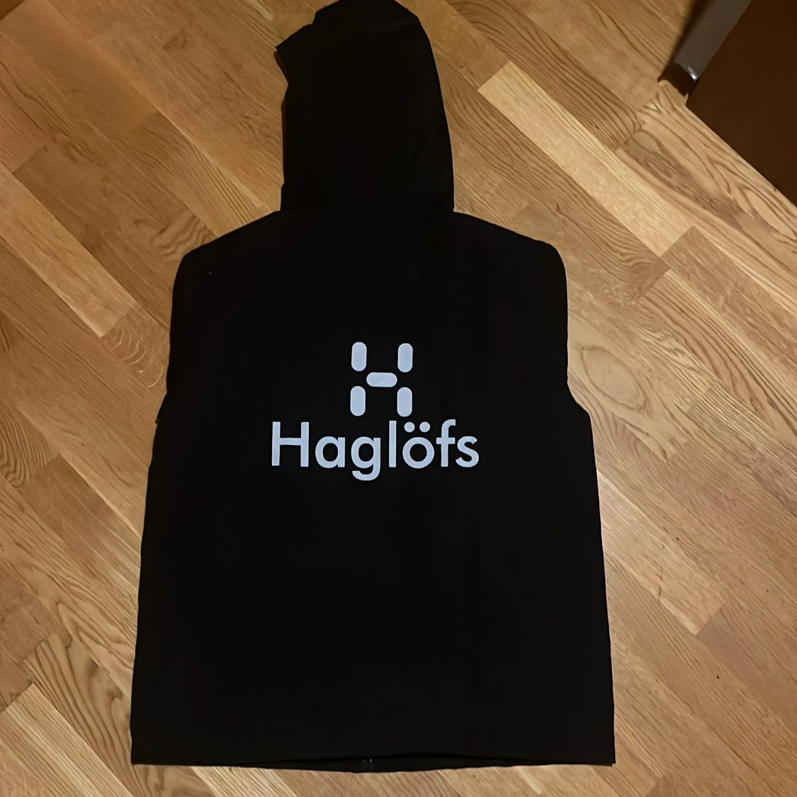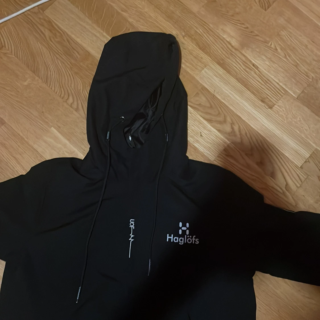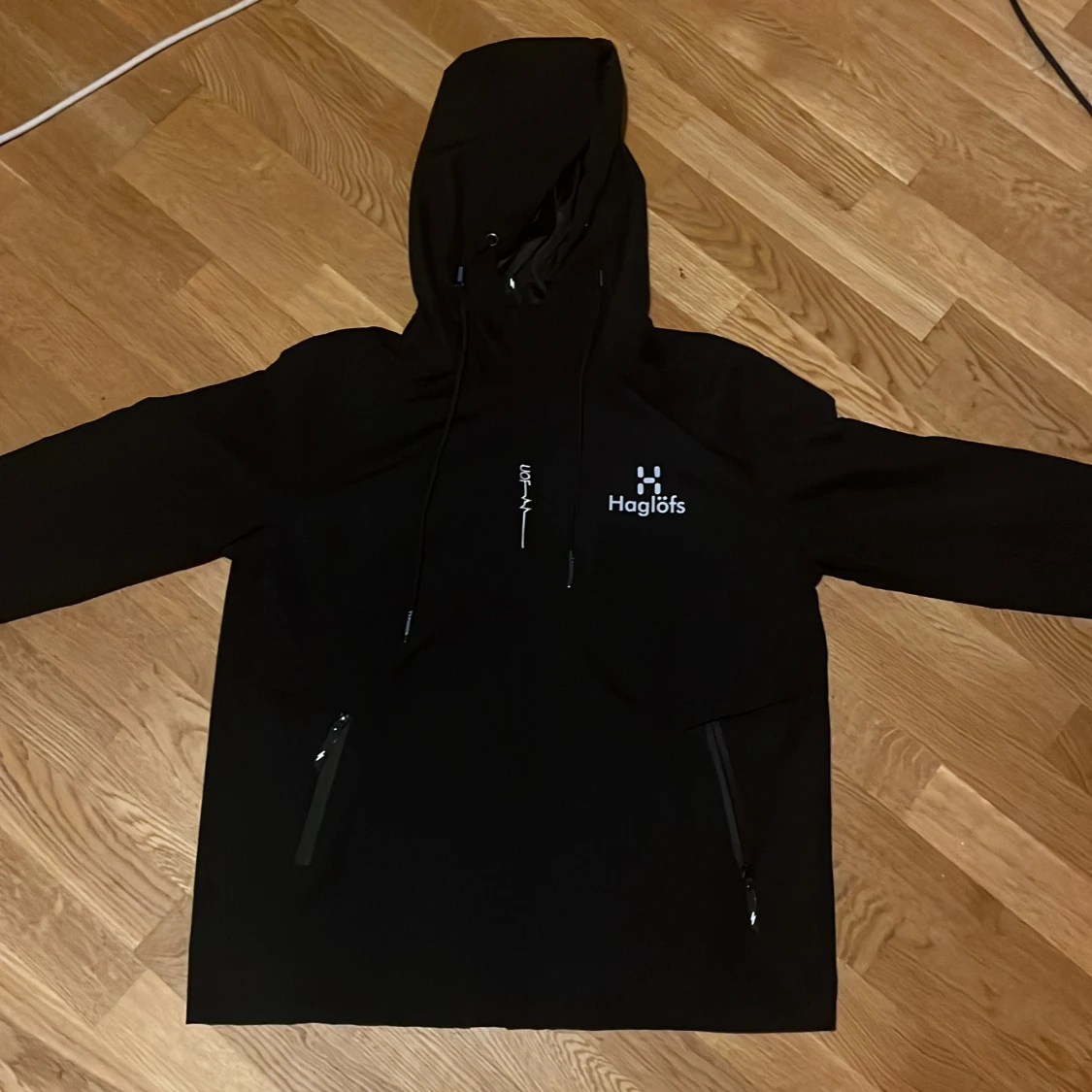 Svart vindjacka från Haglöfs med stor logga på ryggen och mindre logga på bröstet. Jackan har huva med snörning, två snedställda fickor med dragkedja och en clean, sportig look. Perfekt för dig som gillar outdoor och streetstyle Storlek L.