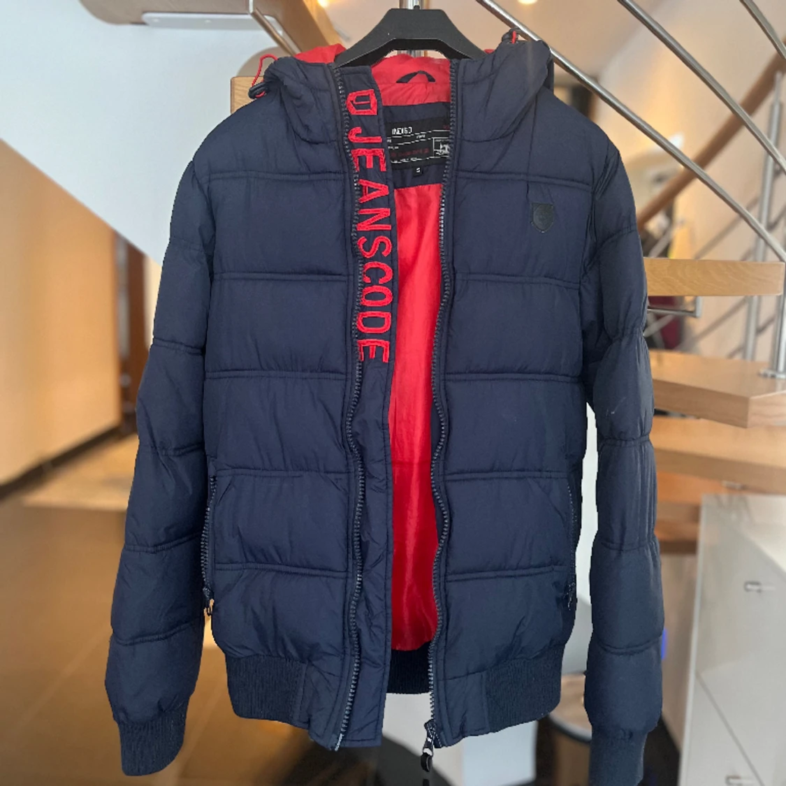 En fin jacka i storlek S som är i väldigt bra skick. Färgen på jackan är marinblå med röda detaljer vid insidan.