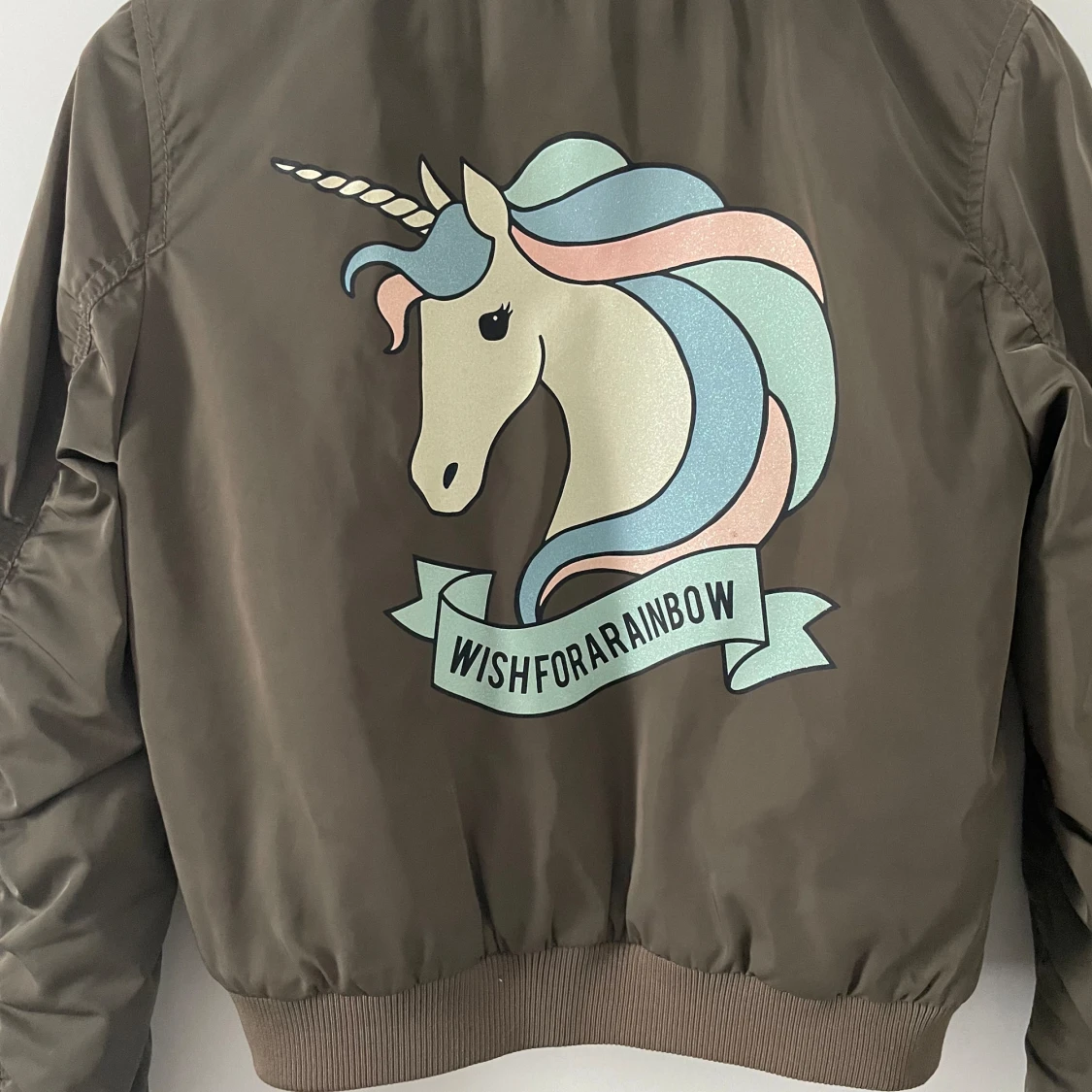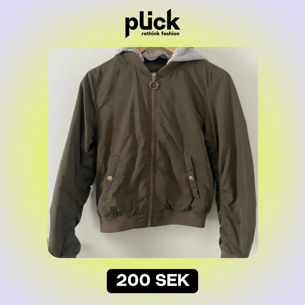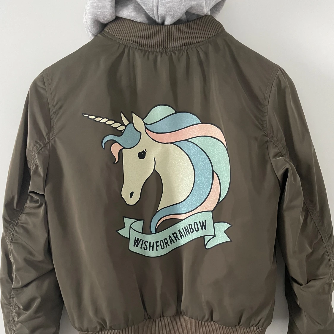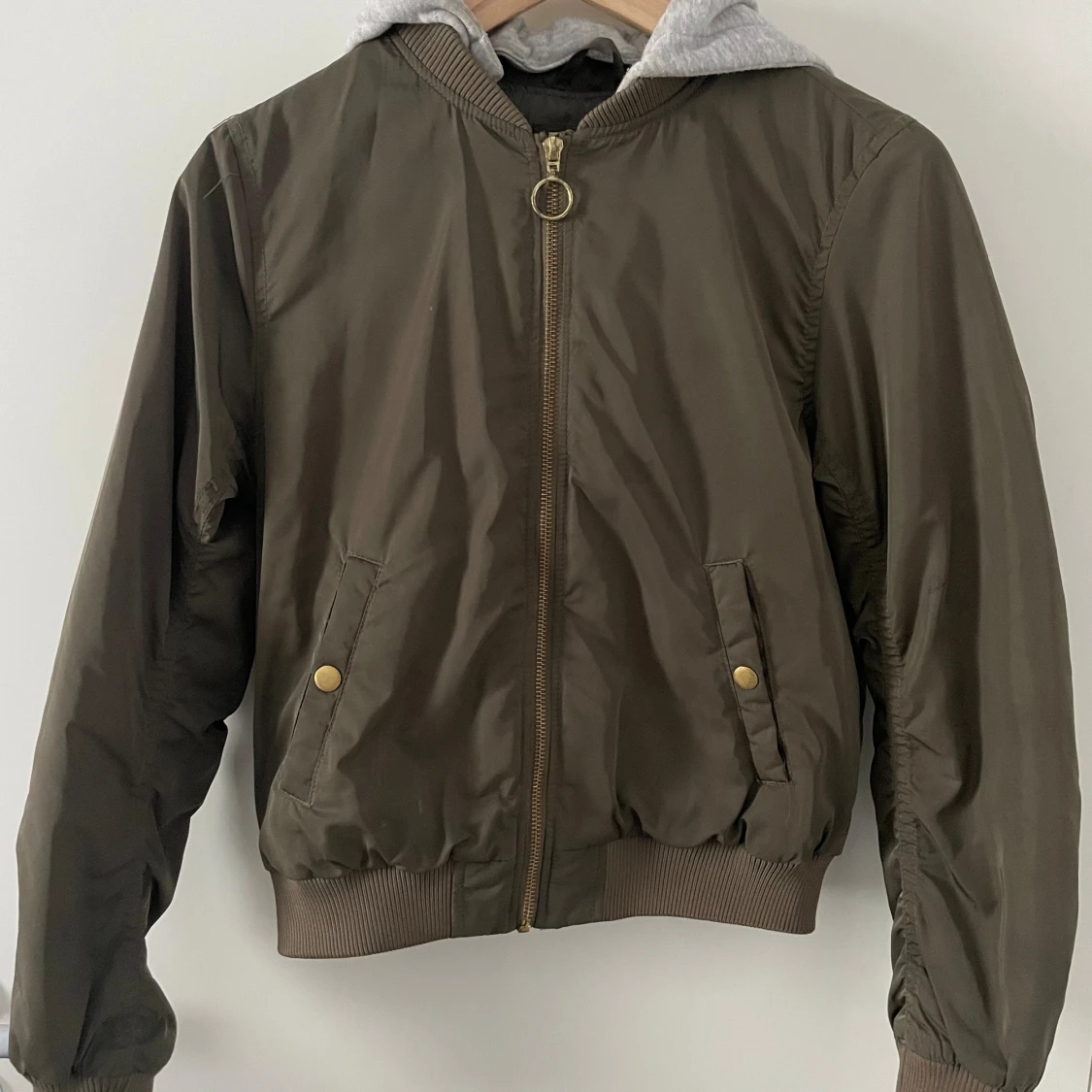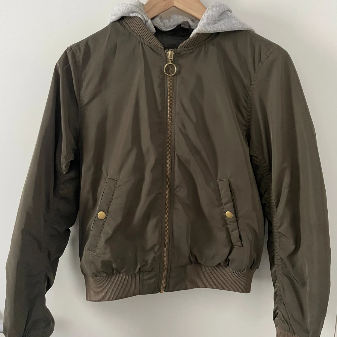 Bomberjacka barn, gott skick (liten fläck på framsidan inte något som syns jättetydligts). Guldiga detaljer (dragkedja & knappar). Avtagbar luva.