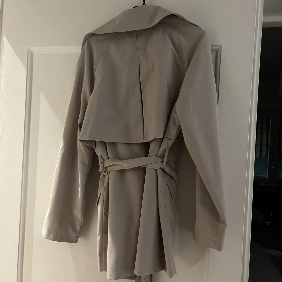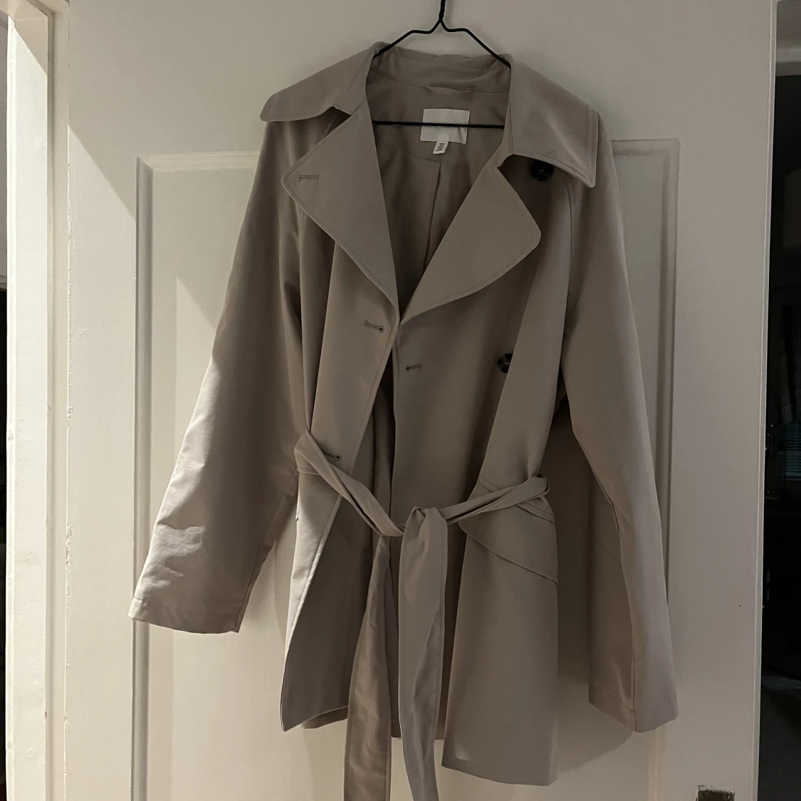 Trenchcoat i kortare modell. Från hm i storlek S, använd ett få tal gånger. Inga slitningar eller liknande. Den är ljus Beige, färgen syns bäst på bild 1