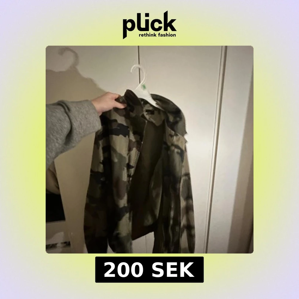 Säljer en grön-brun camouflage overshirt från H&M med tryck på ryggen. Jackan har klassisk krage, knappar på axlarna och lång ärm. Perfekt för dig som gillar streetstyle och vill sticka ut med coola detaljer.