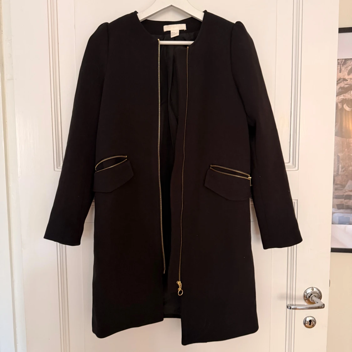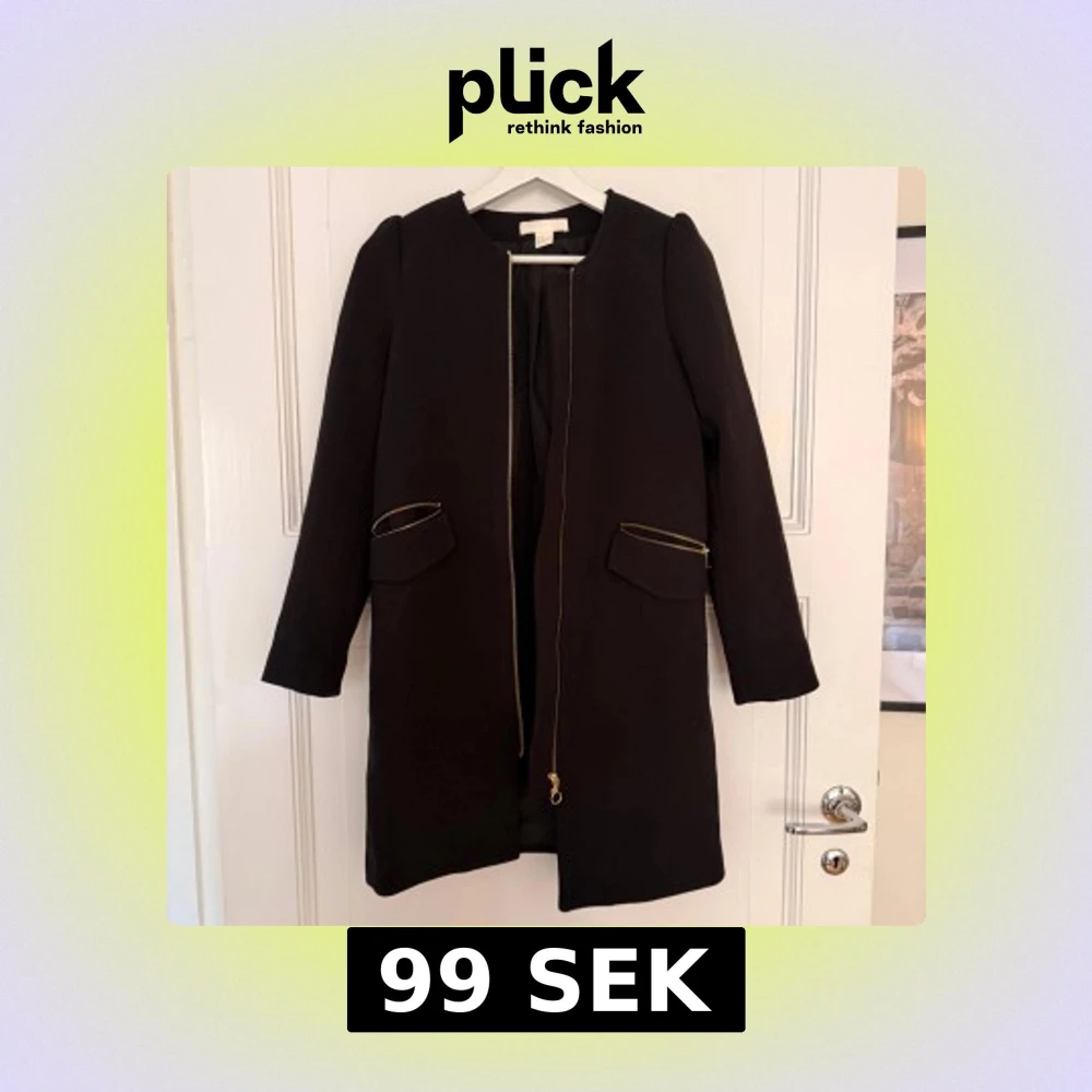 Stilren svart kappa från H&M i storlek 32. Jackan har raka linjer, lång ärm och snygga guldfärgade dragkedjor vid fickorna och framtill. Perfekt för dig som gillar minimalistisk och clean look.
