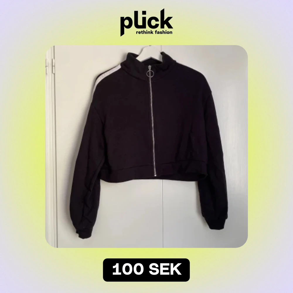 Säljer en svart croppad jacka från H&M. Den har en dragkedja framtill och en vit rand längs ärmarna. Perfekt för en avslappnad stil och passar bra till både jeans och kjol. Jackan är i bra skick och redo för en ny ägare!