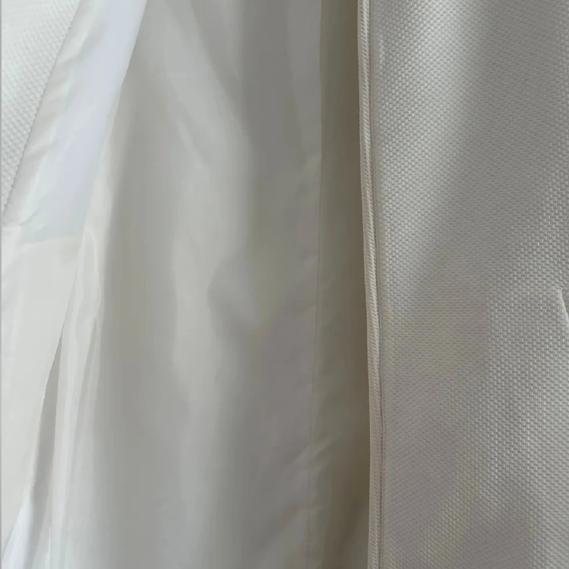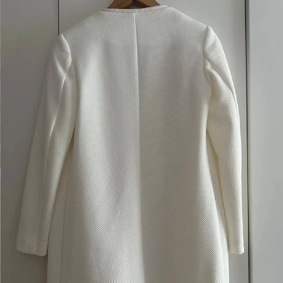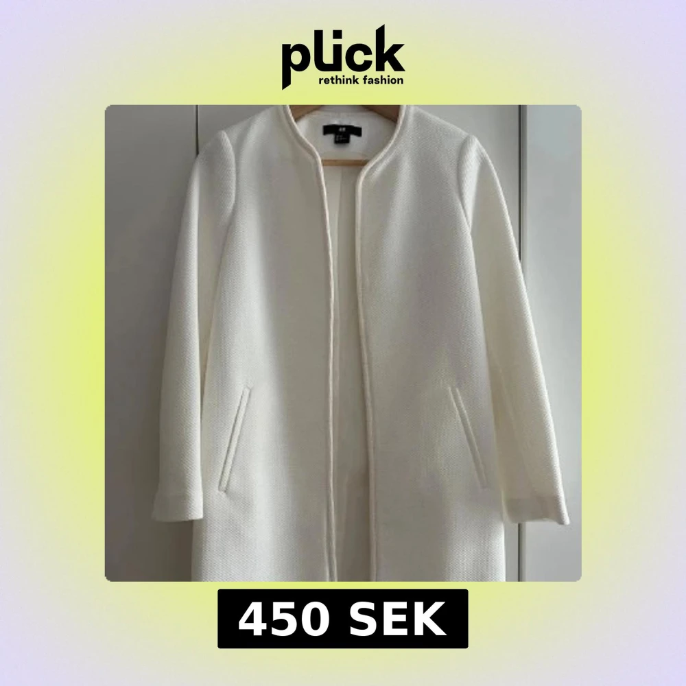 Säljer en stilren vit kappa från H&M med rak passform och diskret struktur i tyget. Jackan har lång ärm, två fickor framtill och är helt utan knappar eller dragkedja för en clean look. Perfekt för dig som gillar minimalistisk stil