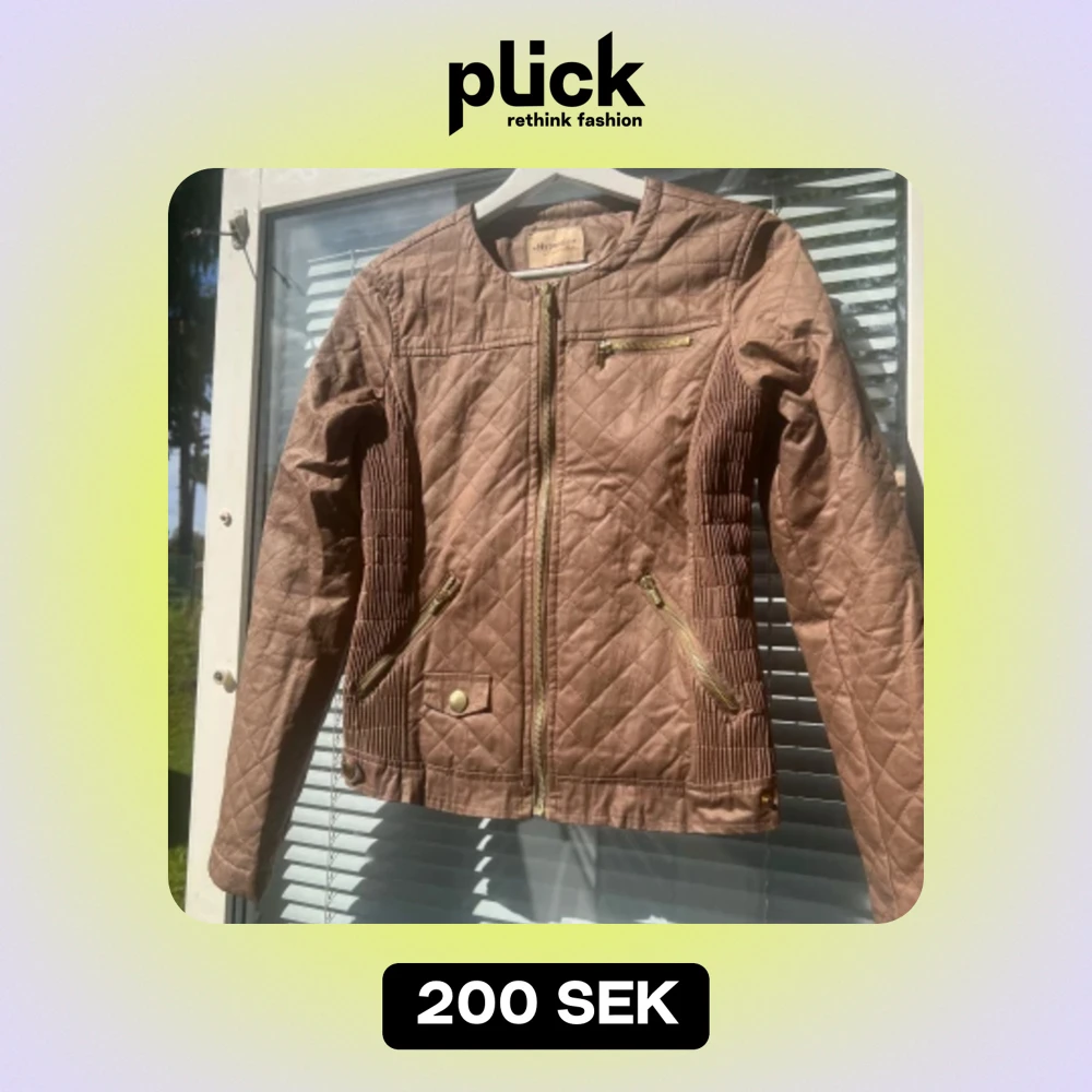 En fin höst jacka, guldiga detaljer samt fickor, färgen är brun, har använts några gånger men är i bra skick och har inga skador eller fläckar, modellen är tajt men annars normal i storleken, storlek S, inuti är den väldigt fin randigt ljusblå.