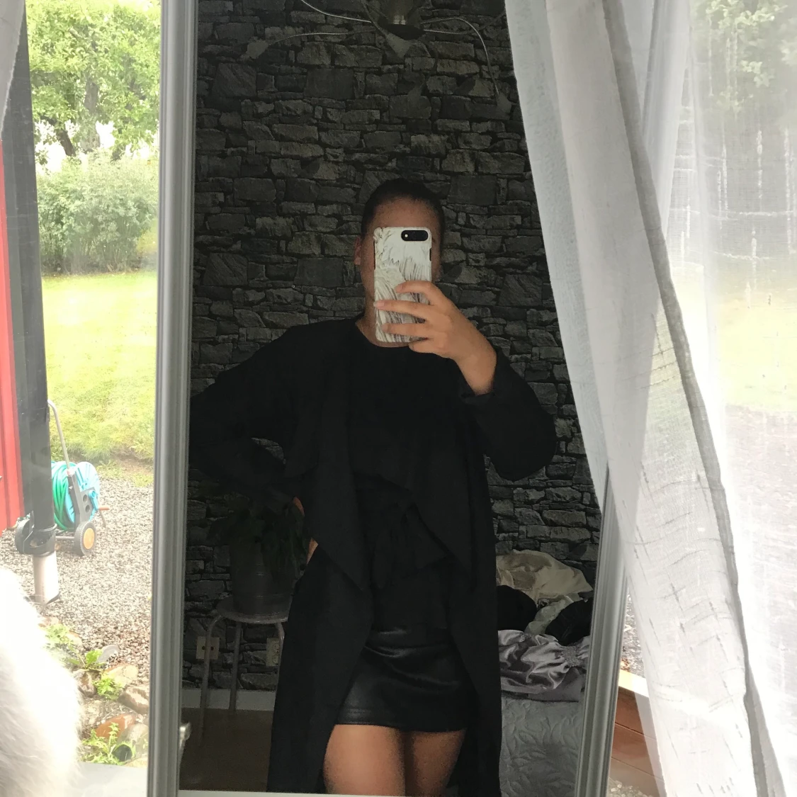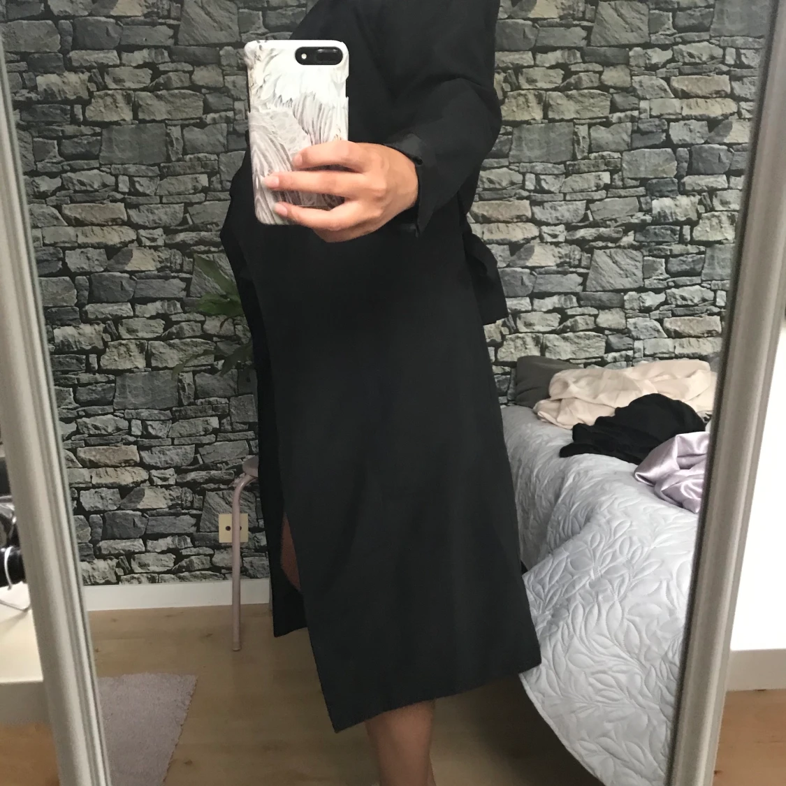 Perfekt sensommar/höstkappa med band runt midjan. Kappan är lite längre i modellen. Använd ett fåtal gånger.
