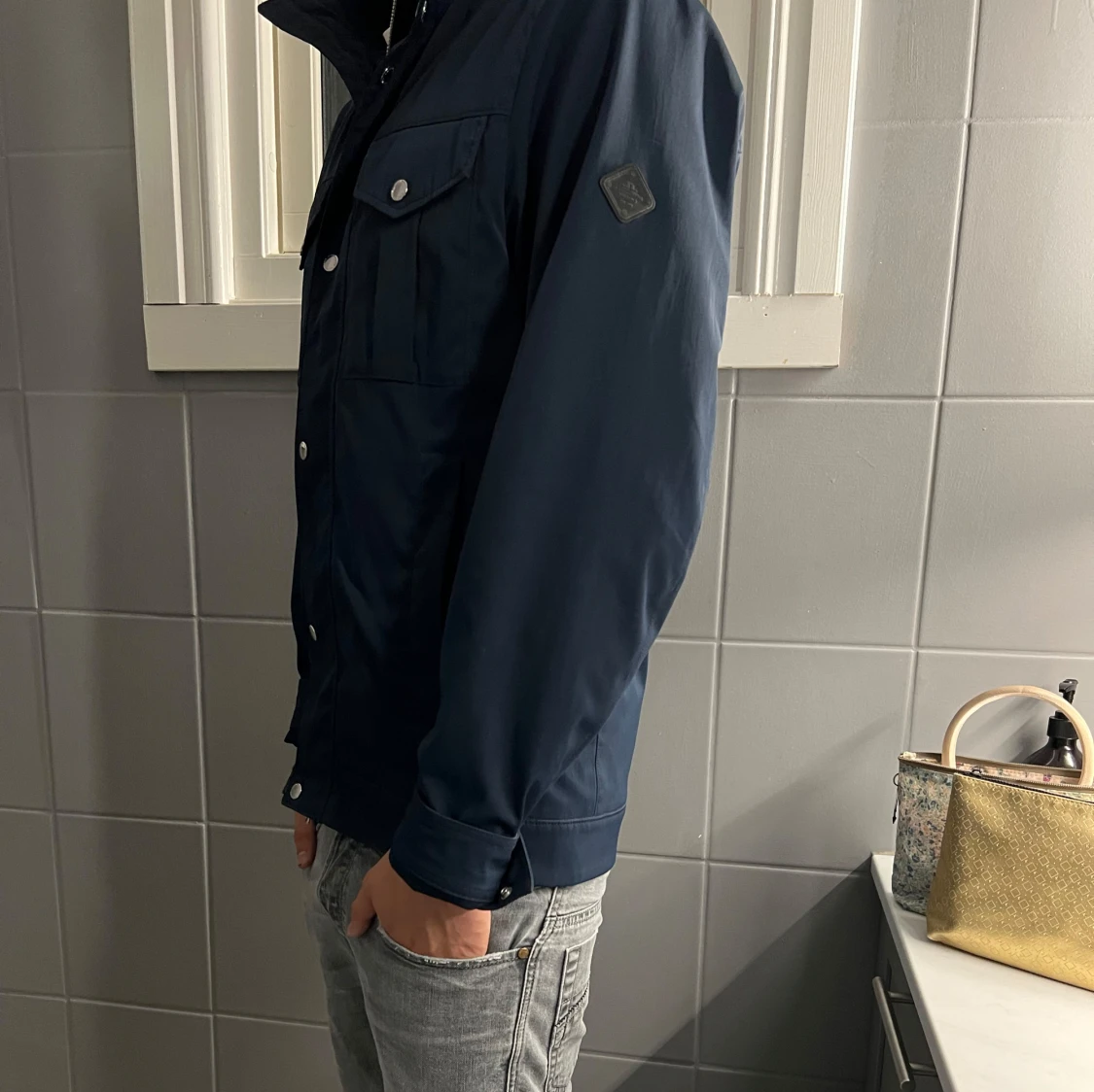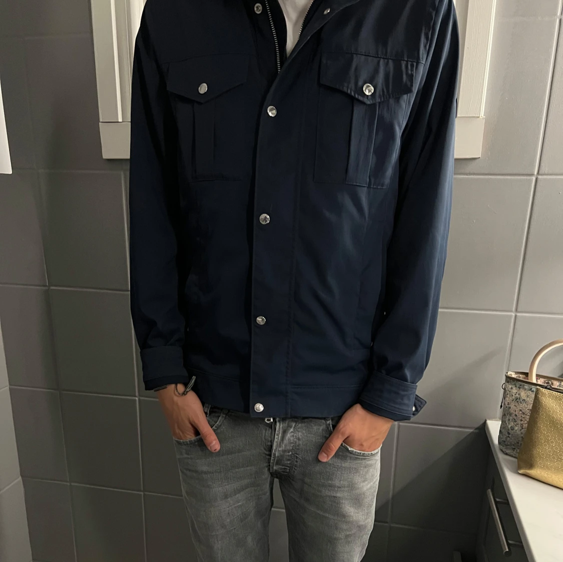 Vi säljer nu denna stilrena mörkblåa fältjavka i storlek S, skick 10/10. jackan är byggd med raka linjer och två bröstfickor med lock och tryckknappar. Jackan har hög krage, långa ärmar och silverfärgade knappar framtill. Jackan är perfekt till dig som letar efter plagg nu inför hösten/vintern. Pris kan diskuteras vid snabb affär och vid fler frågor är det bara att skriva!