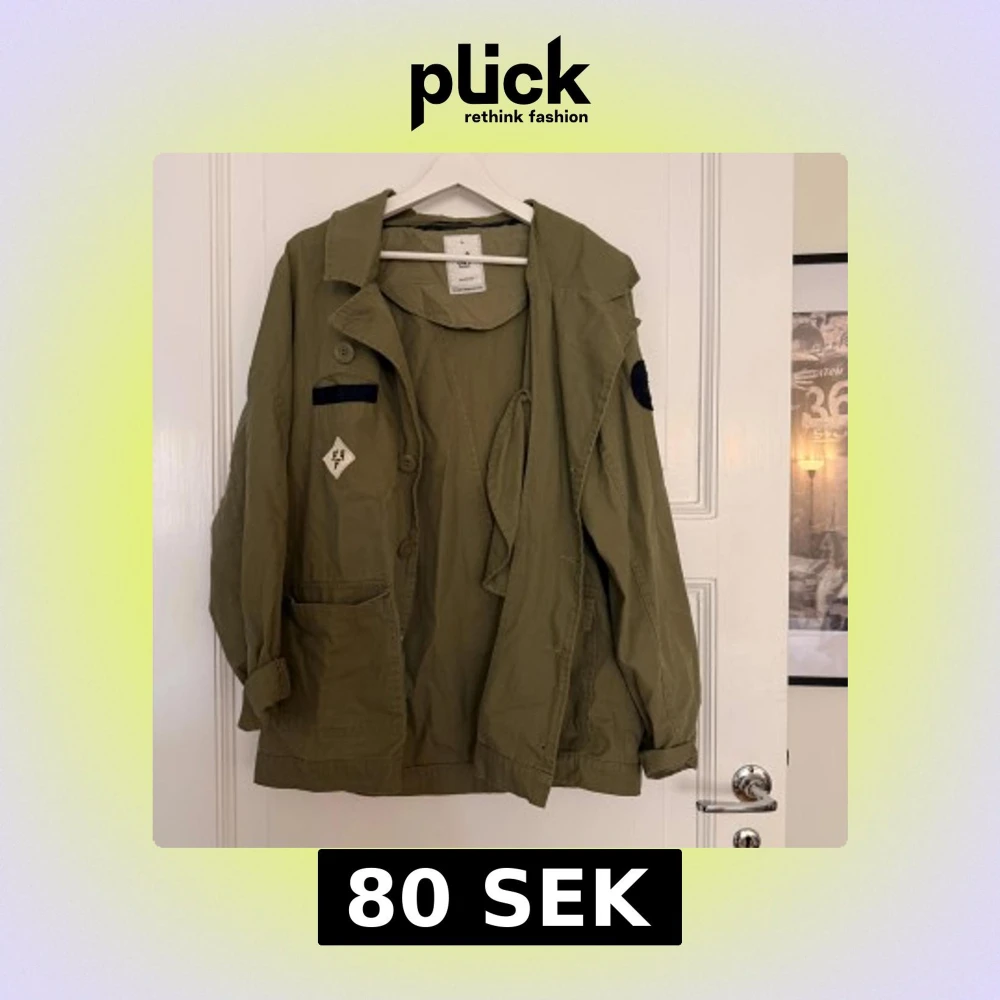 Olivgrön jacka med klassisk krage, knäppning framtill och flera fickor, inklusive en med dragkedja. Jackan har patchdetaljer och en avslappnad passform, perfekt för lager-på-lager. Tillverkad i bomull för en skön känsla. Skulle säga att den passar M också.