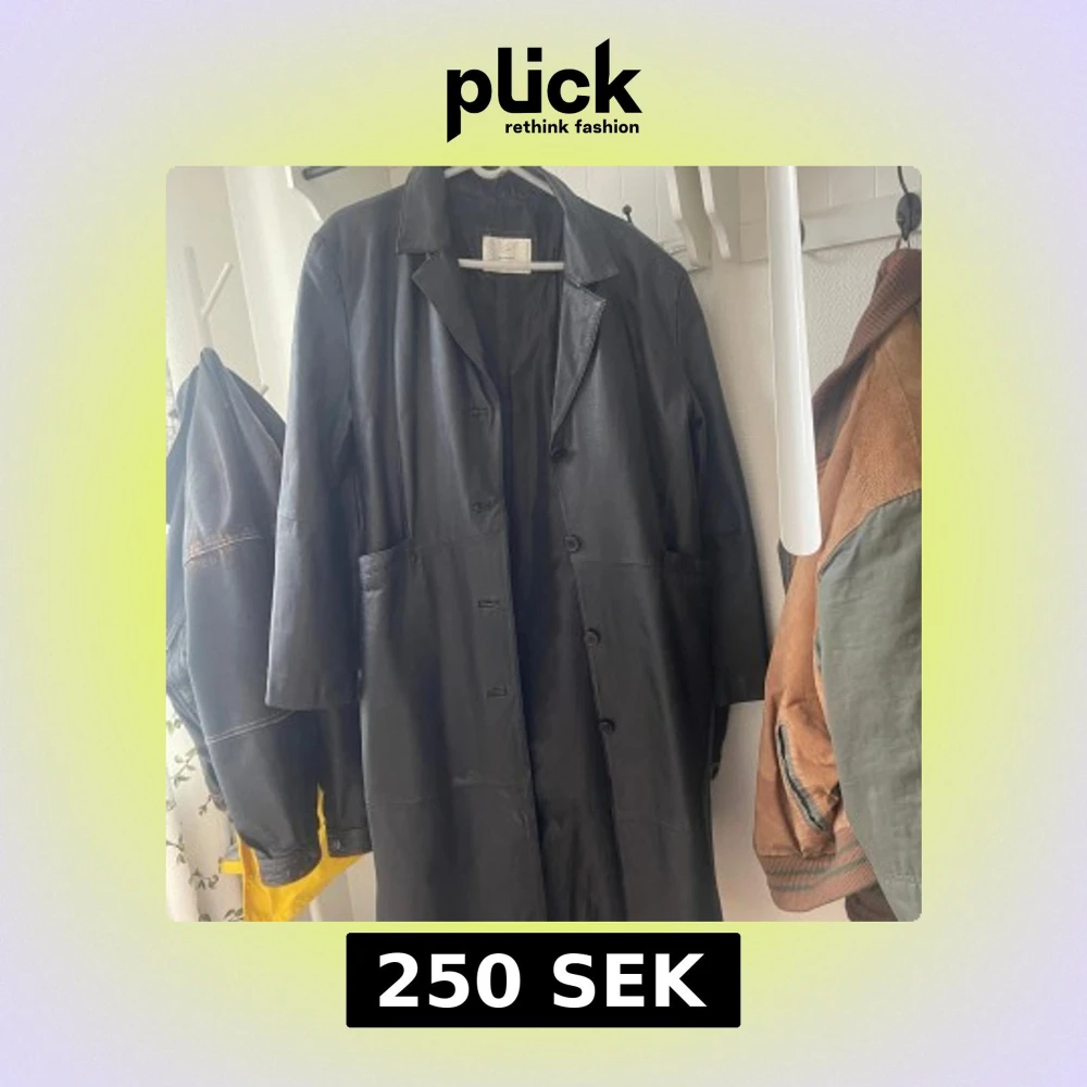 Säljer en stilren svart skinnrock med knappar framtill. Rocken har en klassisk krage och långa ärmar. Den är i gott skick, men har någon fläck på ryggen som jag inte kunde få bort. Går säkert att fixa med sån där läder sörja grej. Storlek står inte men gissar mellan M-L