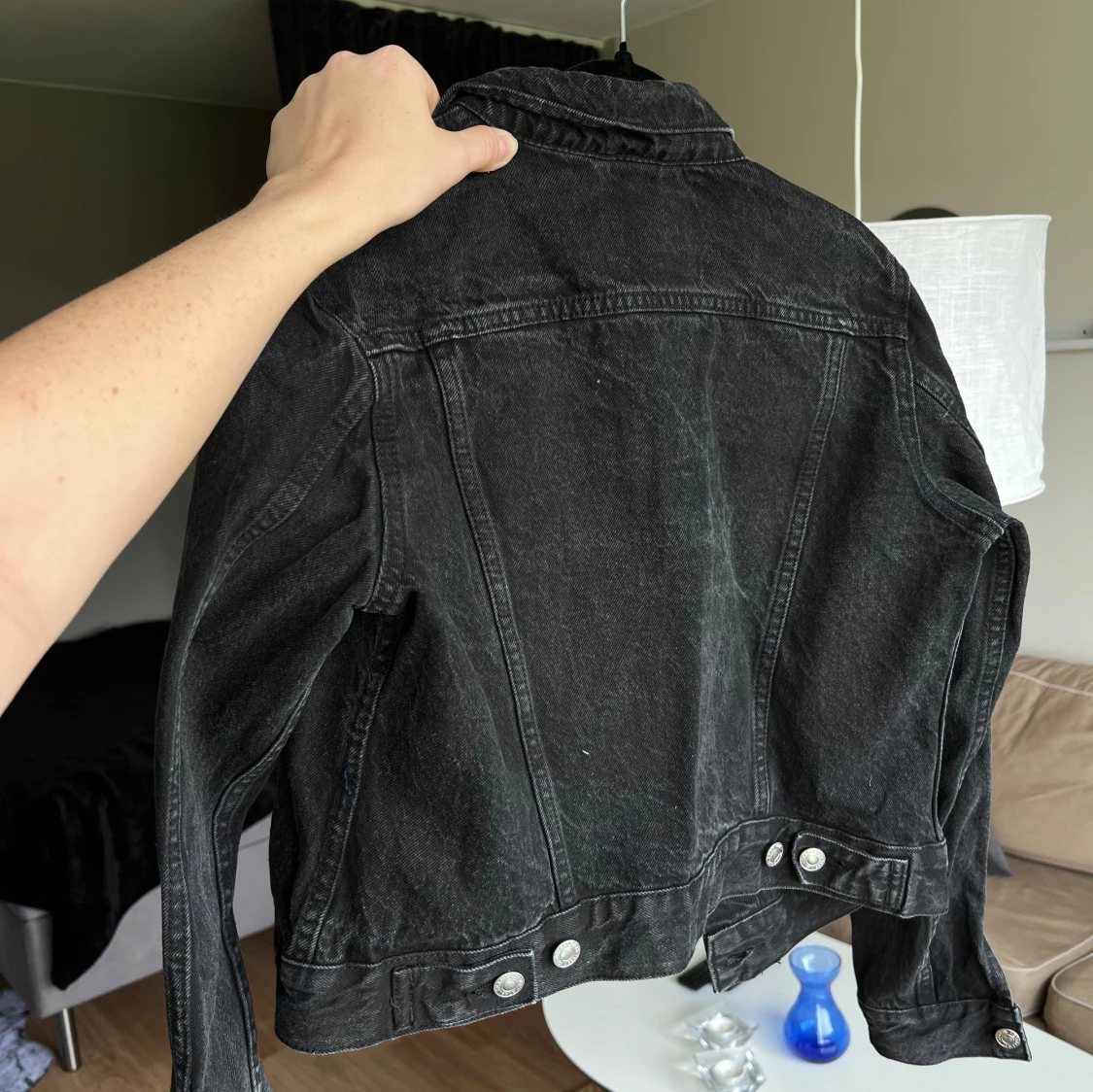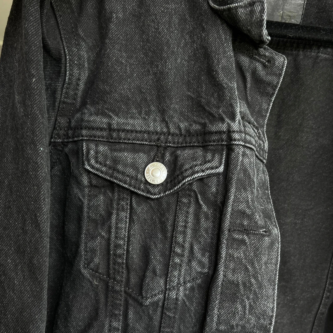Snygg svart jeansjacka från Lager157 i storlek XS. Klassisk modell med silverfärgade knappar, två bröstfickor med lock och krage. Jackan har en cool, lite tvättad look och raka sömmar. Perfekt för dig som gillar streetstyle och vill ha en tidlös jacka i garderoben. Använd en handfull gånger 🖤 Orignialpris 400kr. Önskar du veta exakta mått? Tveka inte att höra av dig!