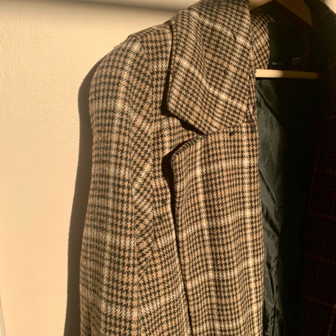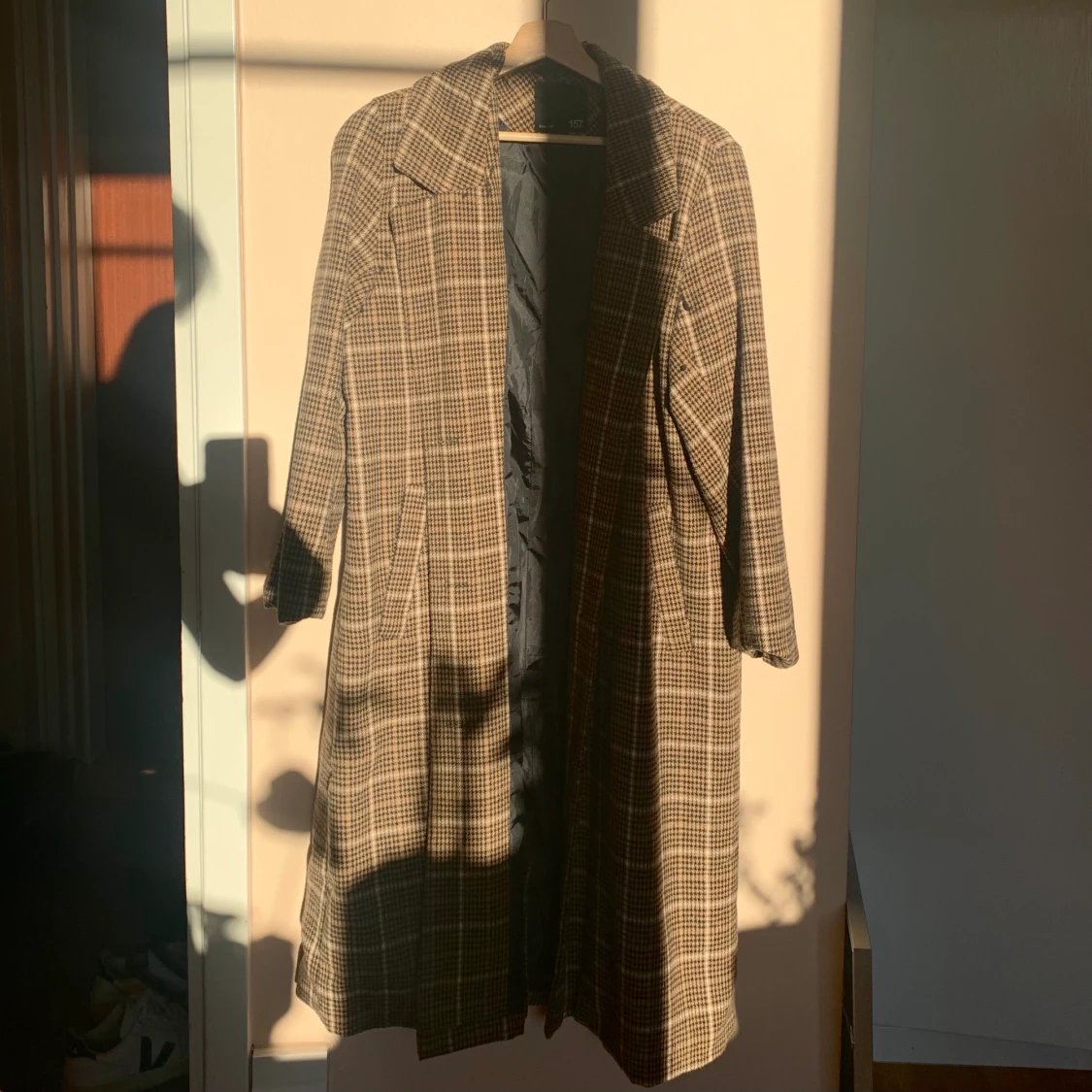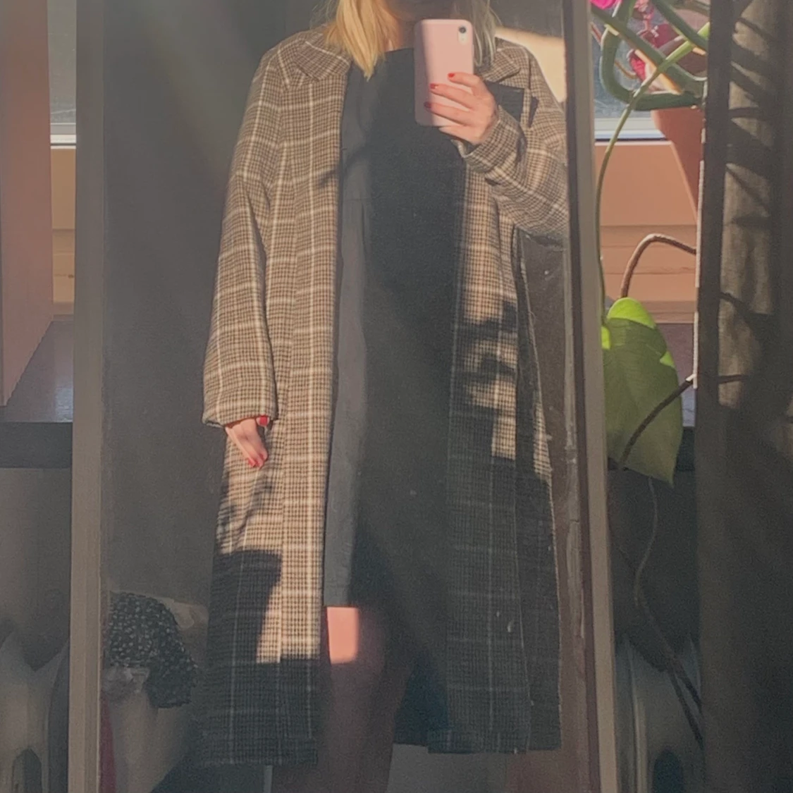 Rutig lång kappa. I storlek L men jag har själv S och kan ha den, tror man kan ha den om man har storlek L också, men då kommer den sitta lite mer figurnära.
