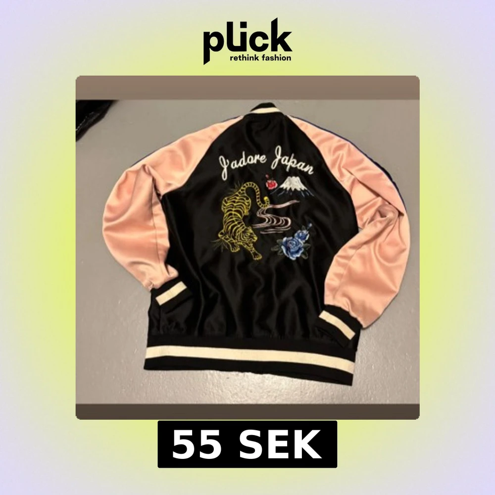 Bomberjacka med svart kropp och ljusrosa ärmar. Broderad tiger, blå ros och berg på ryggen med texten 'J'adore Japan'. Jackan har dragkedja fram, ribbade muddar och coola kontrastdetaljer. Perfekt för dig som vill sticka ut med din stil.