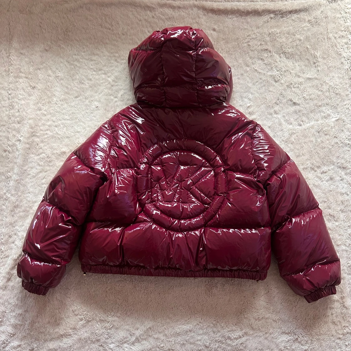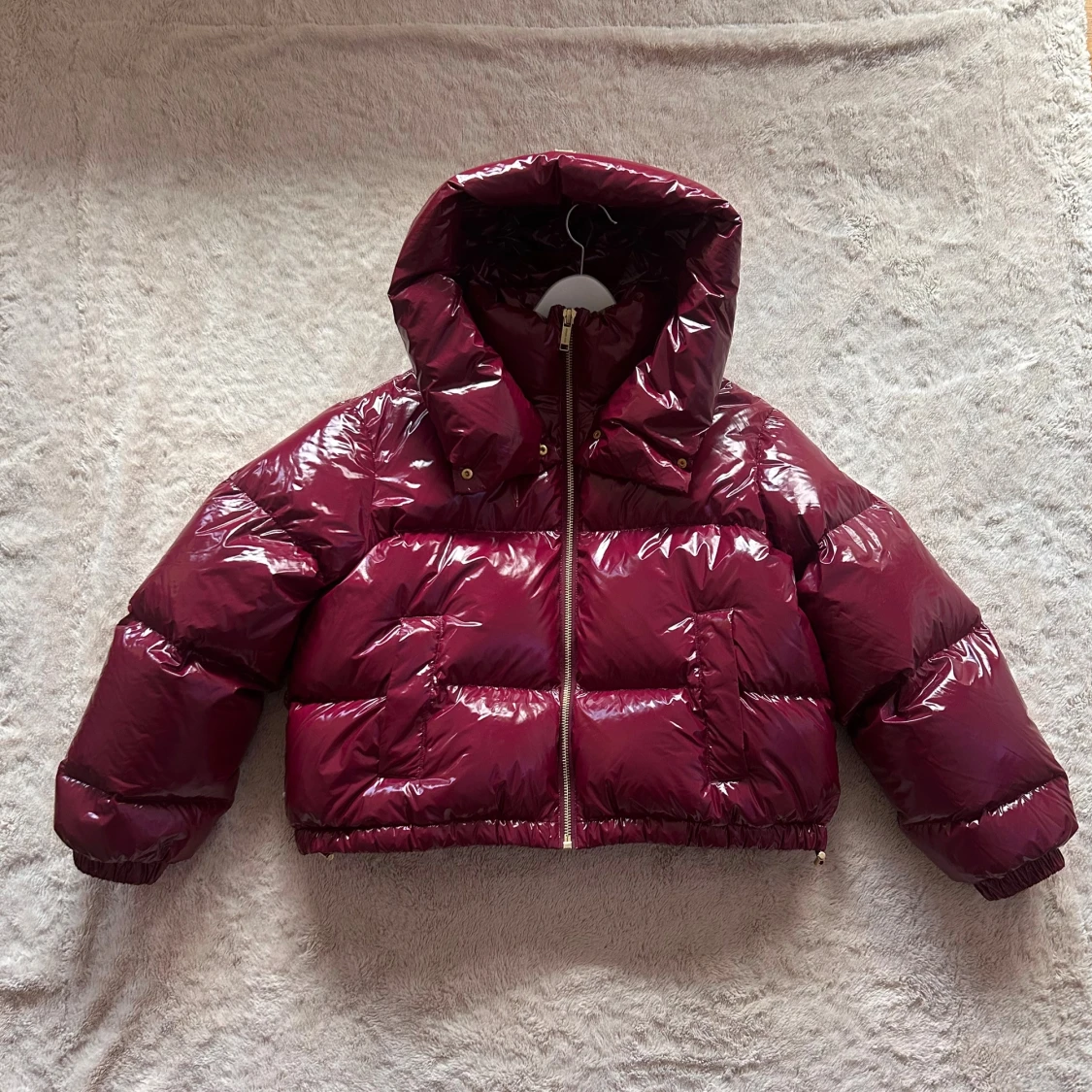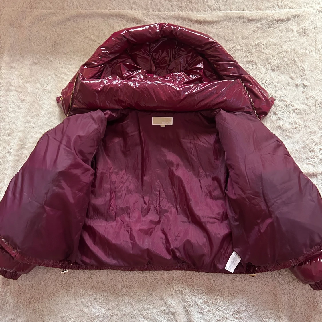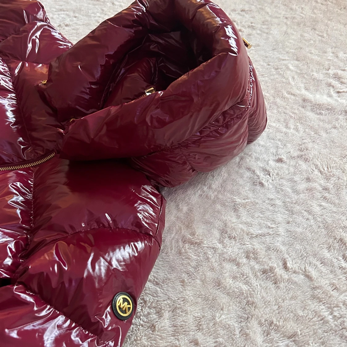 Säljer en glansig vinröd pufferjacka från Michael Kors med huva och guldfärgad dragkedja. Jackan har MK-logga på ärmen och ett stort broderat MK-märke på ryggen. Croppad modell med elastiska muddar och quiltad design. Skick: Nyskick då den endast är testad på. Stolek: (M)💜