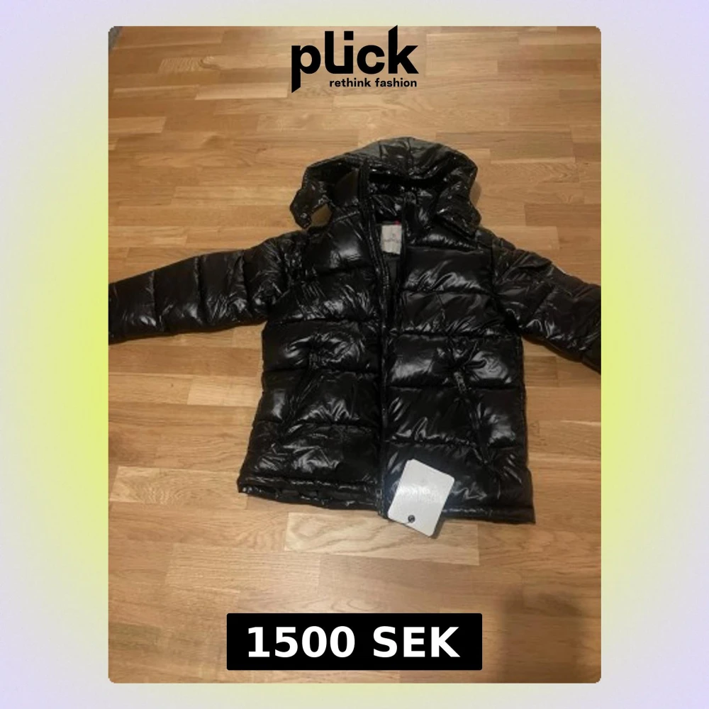 Säljer en svart, glansig pufferjacka från Moncler med huva och dragkedja. Jackan har en ficka med Moncler-logga på ärmen och två snedställda fickor framtill. Insidan har ett coolt serietryck. Perfekt för kalla dagar och riktigt snygg streetstil.