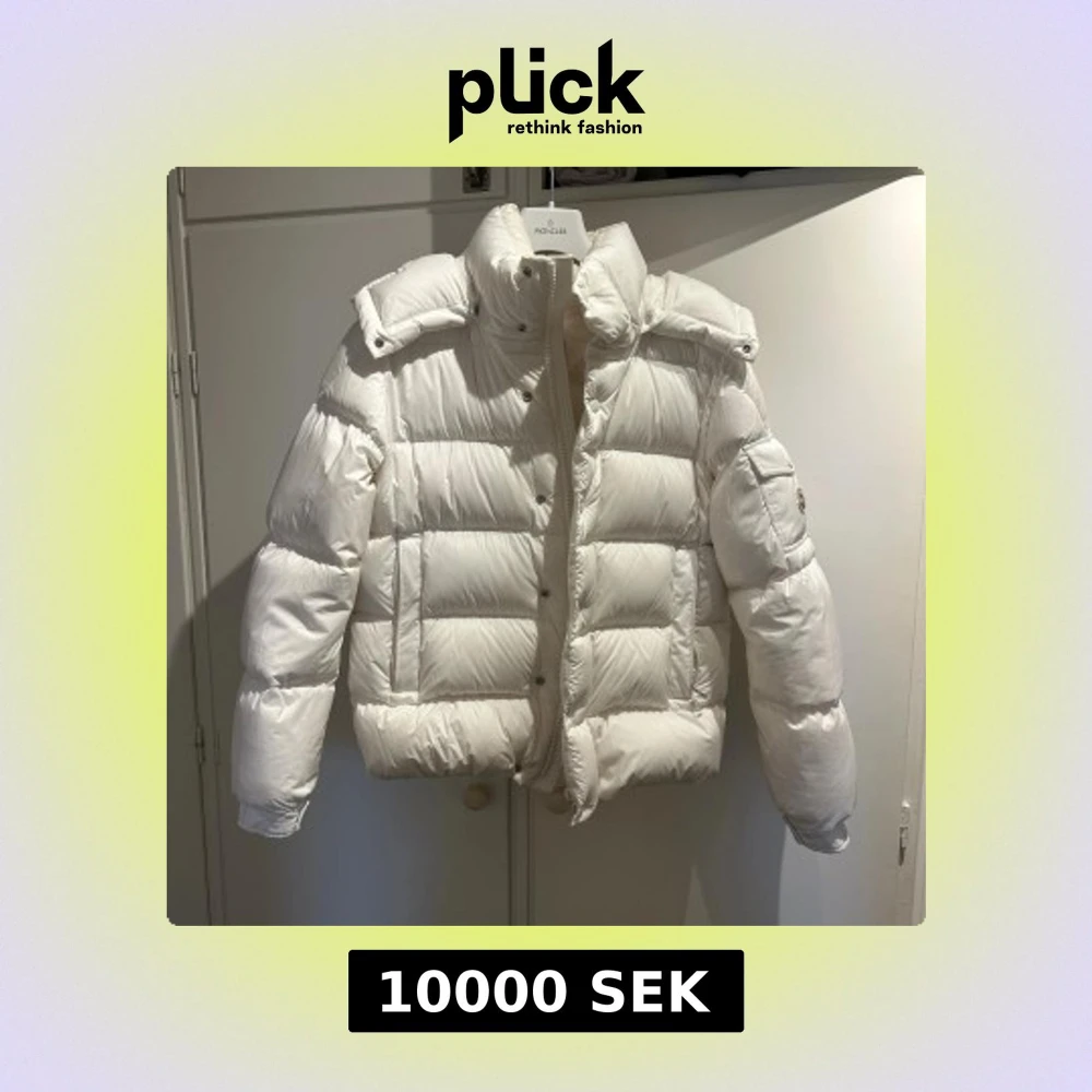 Säljer en vit pufferjacka från Moncler med huva och hög krage. Jackan har Moncler-logga på ärmen, praktiska fickor och dragkedja framtill. Insidan har en cool serietidningsdetalj. Perfekt för dig som vill ha en clean och stilren vinterlook. Storlek 3 typ en medium lite större. Kvitto finns köpt på nk förra vinter