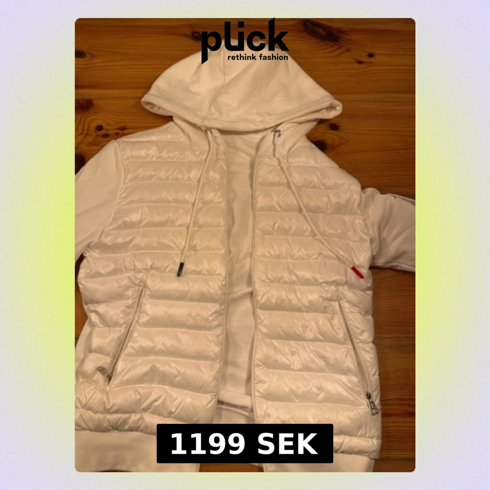 Säljer en snygg vit cardigan från Moncler med huva och dragkedja. Cardigan har quiltad framsida, två fickor med dragkedja och en Moncler-logga på ärmen. NFC tagen funkar. Inget fel på den. Oanvänd med.