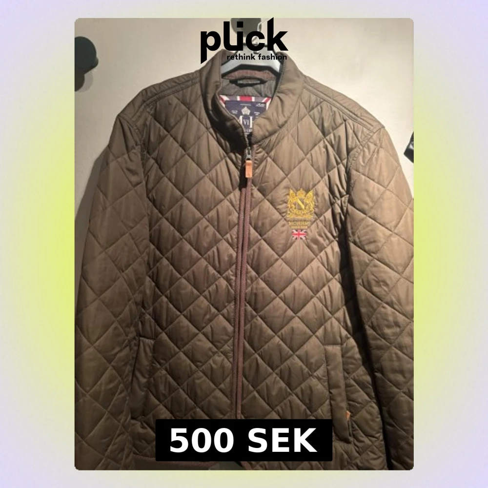Snygg quiltad brun jacka från Morris med gul brodyr och brittisk flagga på bröstet. Jackan har dragkedja framtill, ribbade detaljer och två fickor. Perfekt för dig som gillar klassisk stil med modern twist.