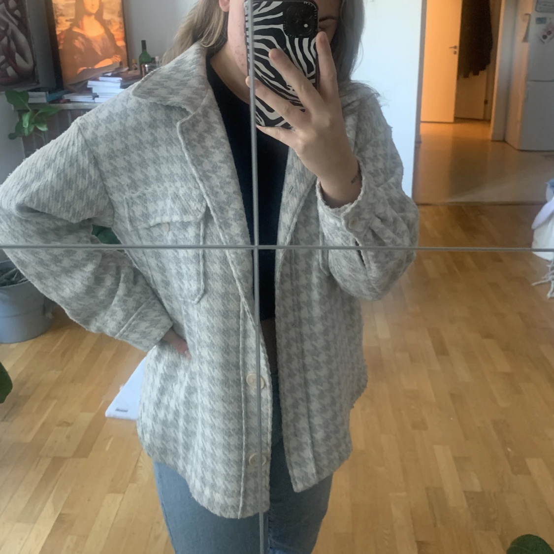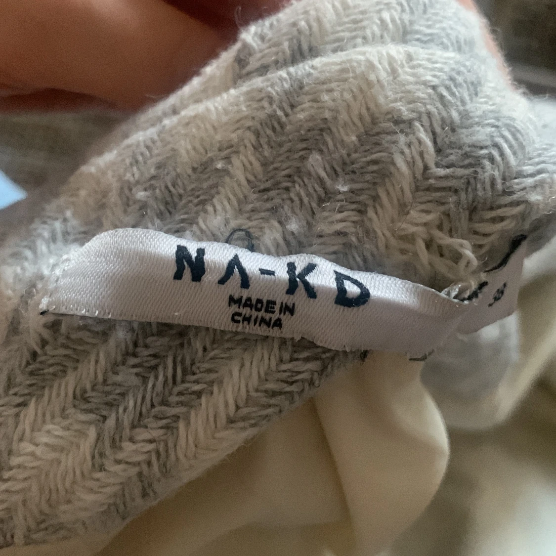 Höst/vårjacka för de lite kyligare tiderna. Väl använd. Någon tråd som sticker ut (enkelt fixat genom att trä den igenom). Färgen är melerad i grått och vitt men går lite åt det blå hållet på det gråa.