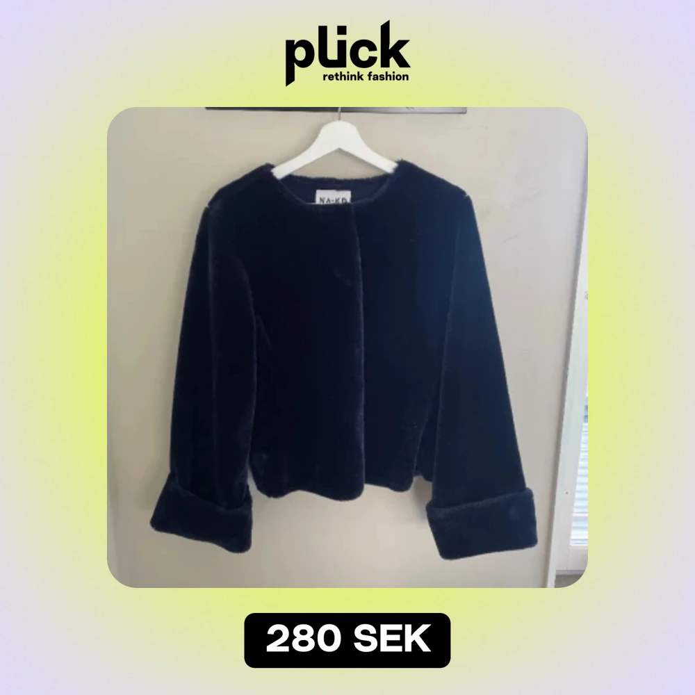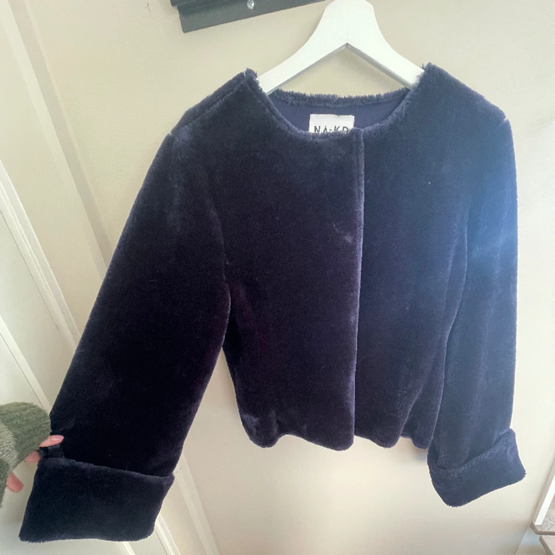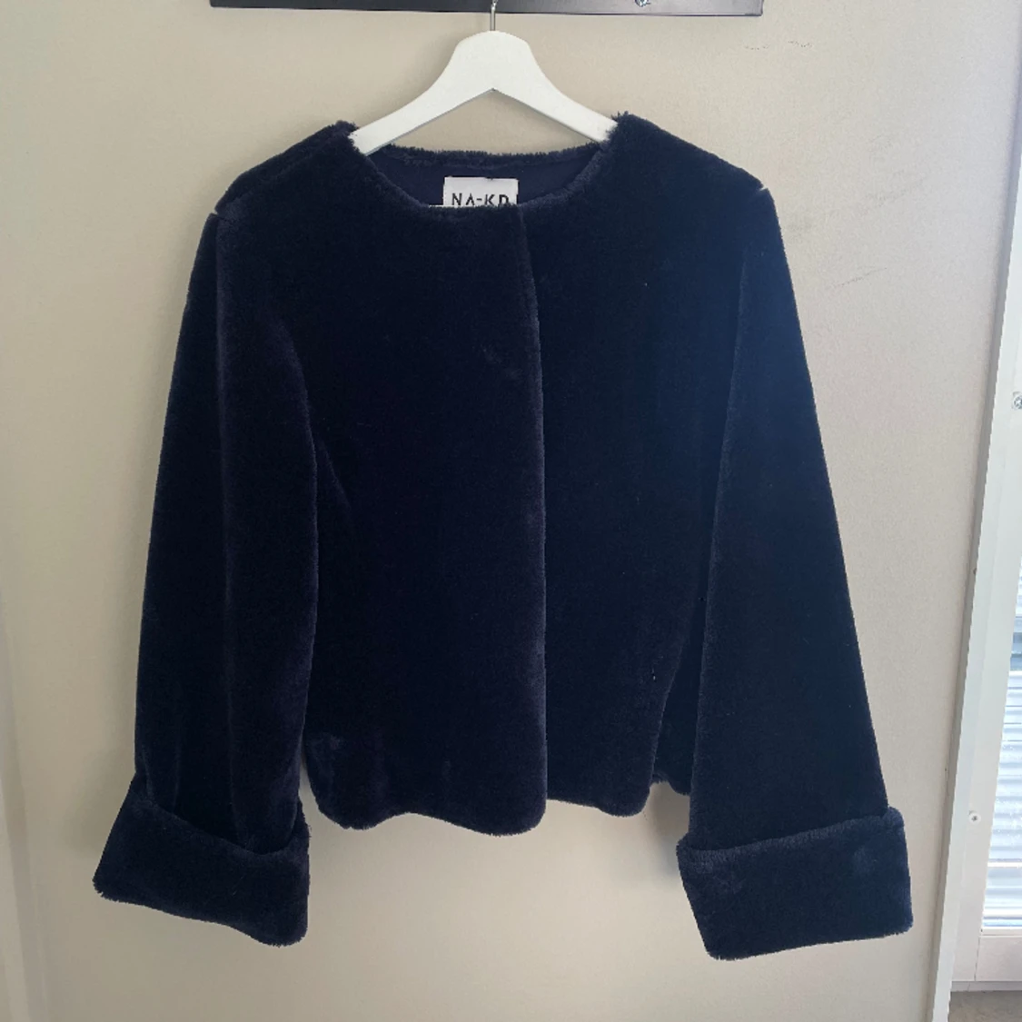 Fluffig jacka från NA-KD i mörkblå färg. Som ny! Vida ärmar😍 Jackan är i 38 men skulle säga att den definitivt passar en 36 också.