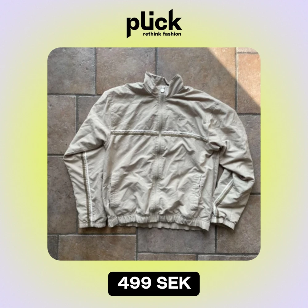 Säljer en beige vindjacka från Nike i storlek S. Jackan har en dragkedja framtill och är långärmad med elastiska muddar. Perfekt för vår och höst med sin lätta och bekväma passform. Nike-loggan är broderad på bröstet och dragkedjan har en snygg Nike-
