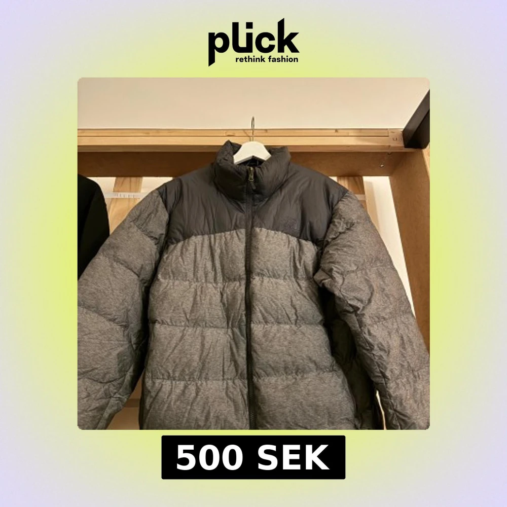 Säljer en grå dunjacka från The North Face med svarta detaljer. Jackan har en dragkedja framtill och är perfekt för kyligare väder. Storlek L