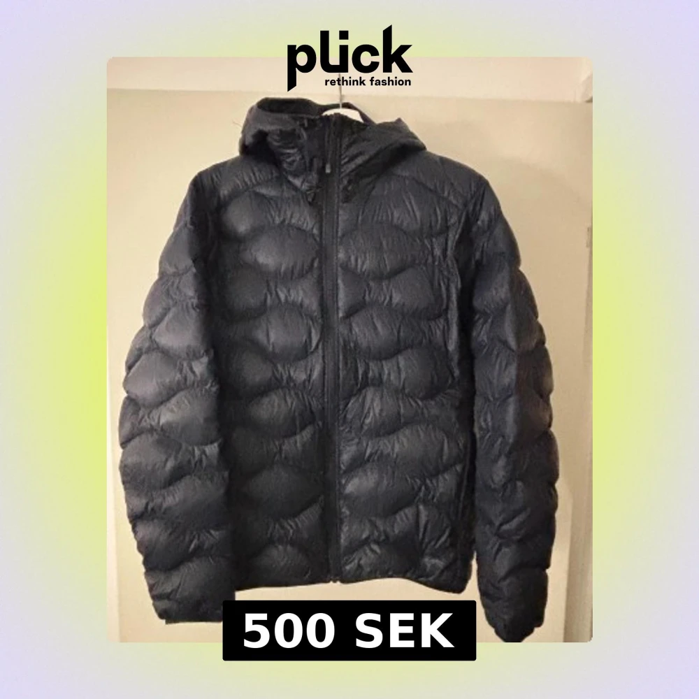 Säljer en svart dunjacka med huva och dragkedja framtill. Jackan har quiltad design och lång ärm, perfekt för kyliga dagar. Enkel och stilren modell som passar till det mesta.