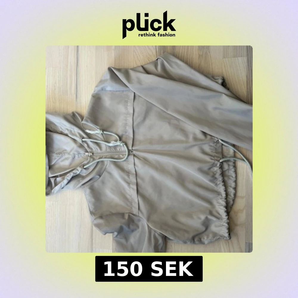 Säljer en beige croppad vindjacka från PrettyLittleThing med huva, dragkedja och dragsnöre i midjan. Jackan har långa ärmar och en avslappnad passform, perfekt för blåsiga dagar.