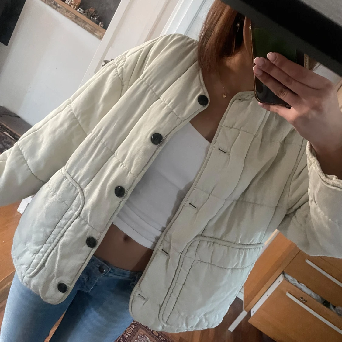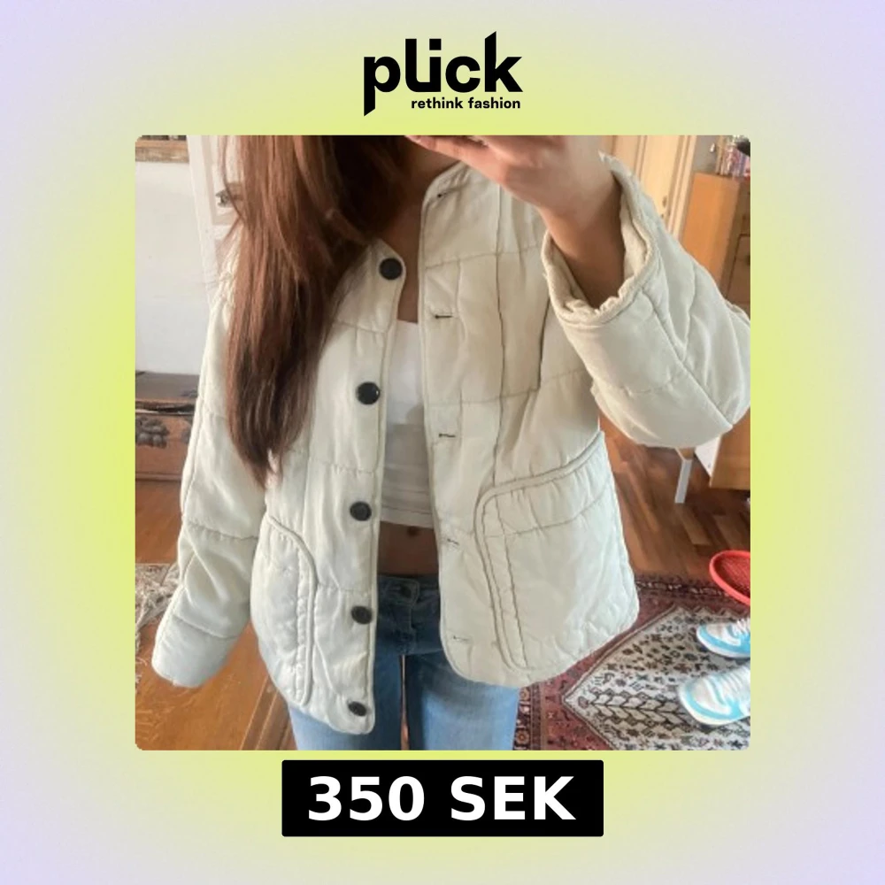 Lånade bilder från förra ägaren!💗 Säljer en snygg vit quiltad jacka från Zara med stora svarta knappar. Jackan har en avslappnad passform och är perfekt för kyligare dagar. Den har långa ärmar och en stilren design som passar till många olika outfits. Passar xs-m. använd gärna köp nu❣️