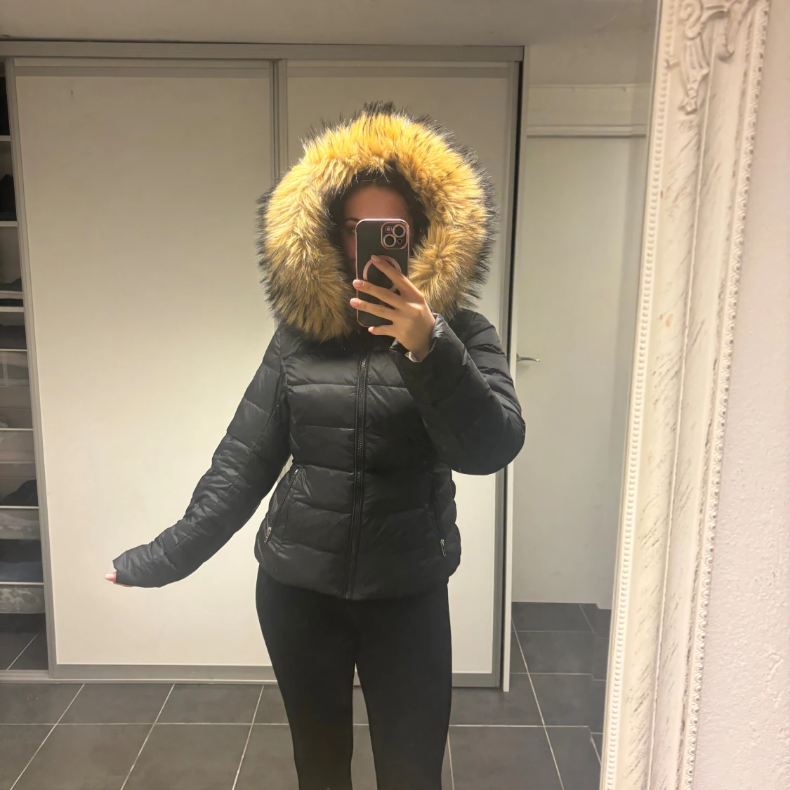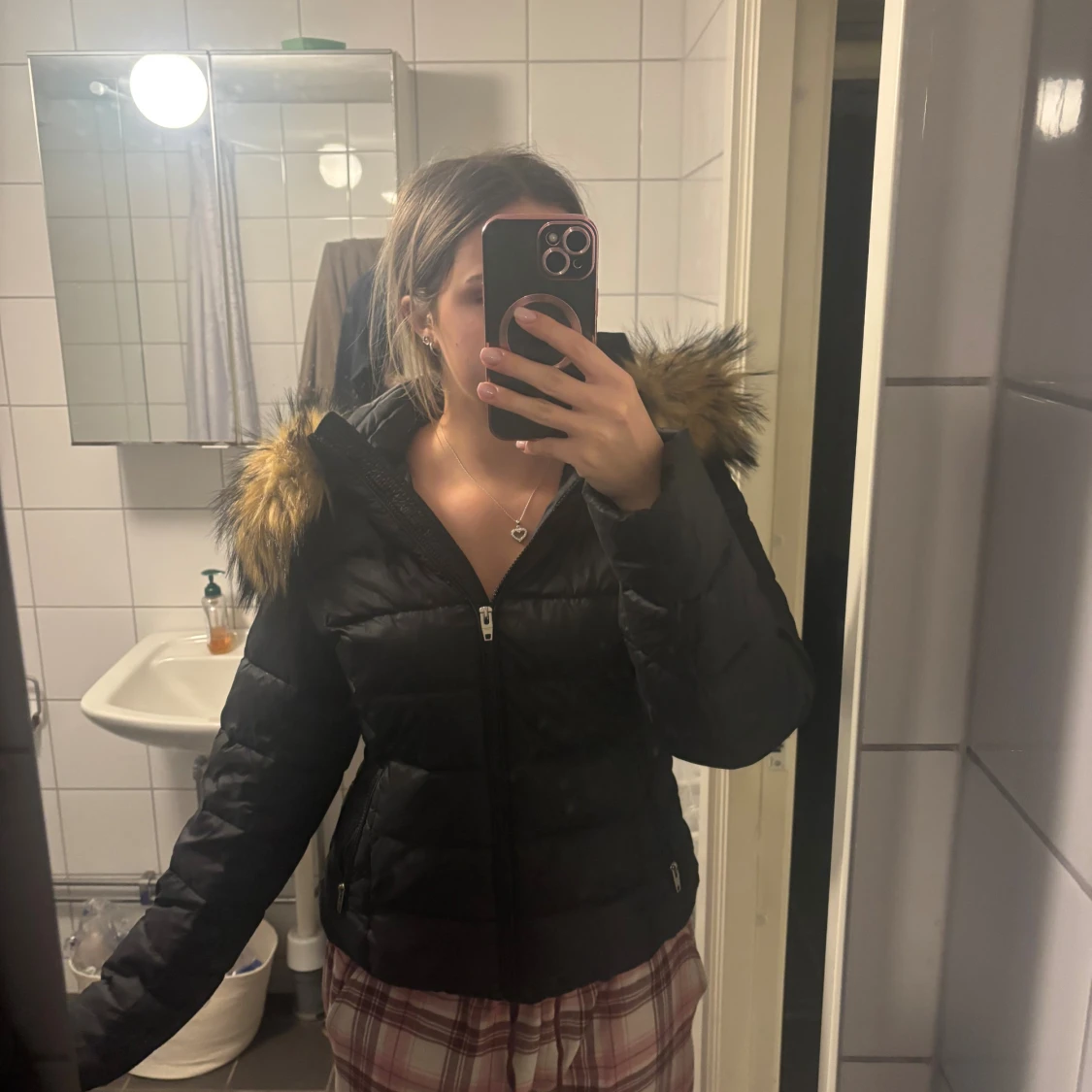 storlek m-xl men även mig som har xs, varm vinter jacka med päls, perfekt nu inför hösten o vintern. Från rock & blue.