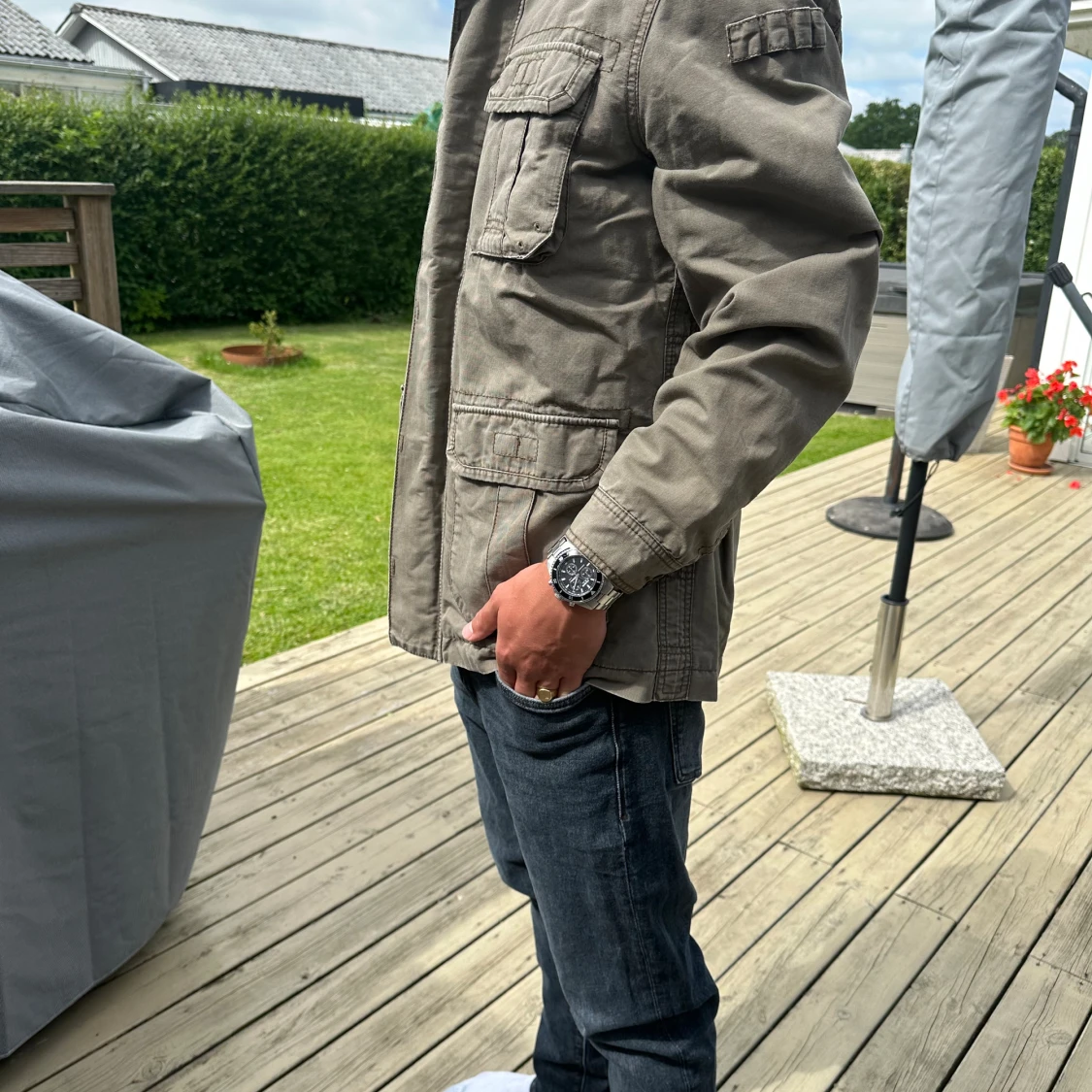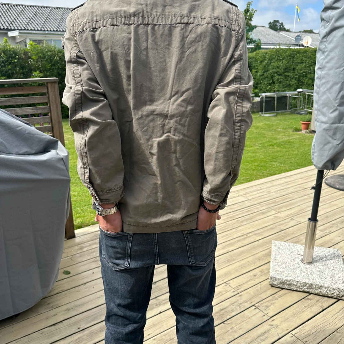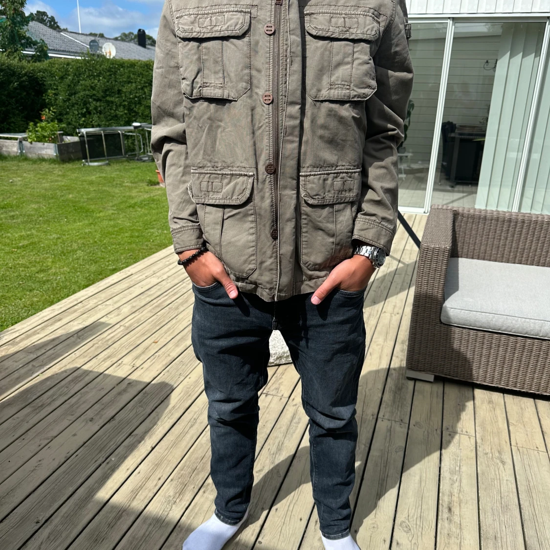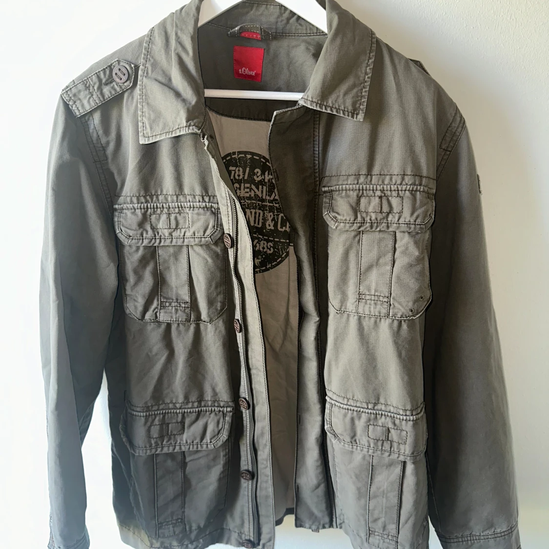 Galet snygg safarijacka från S.Oliver. Storlek L. Modellen på bilden är 183 cm lång och väger 72 kg. Inga tecken på användning - inga defekter. Pris 499.