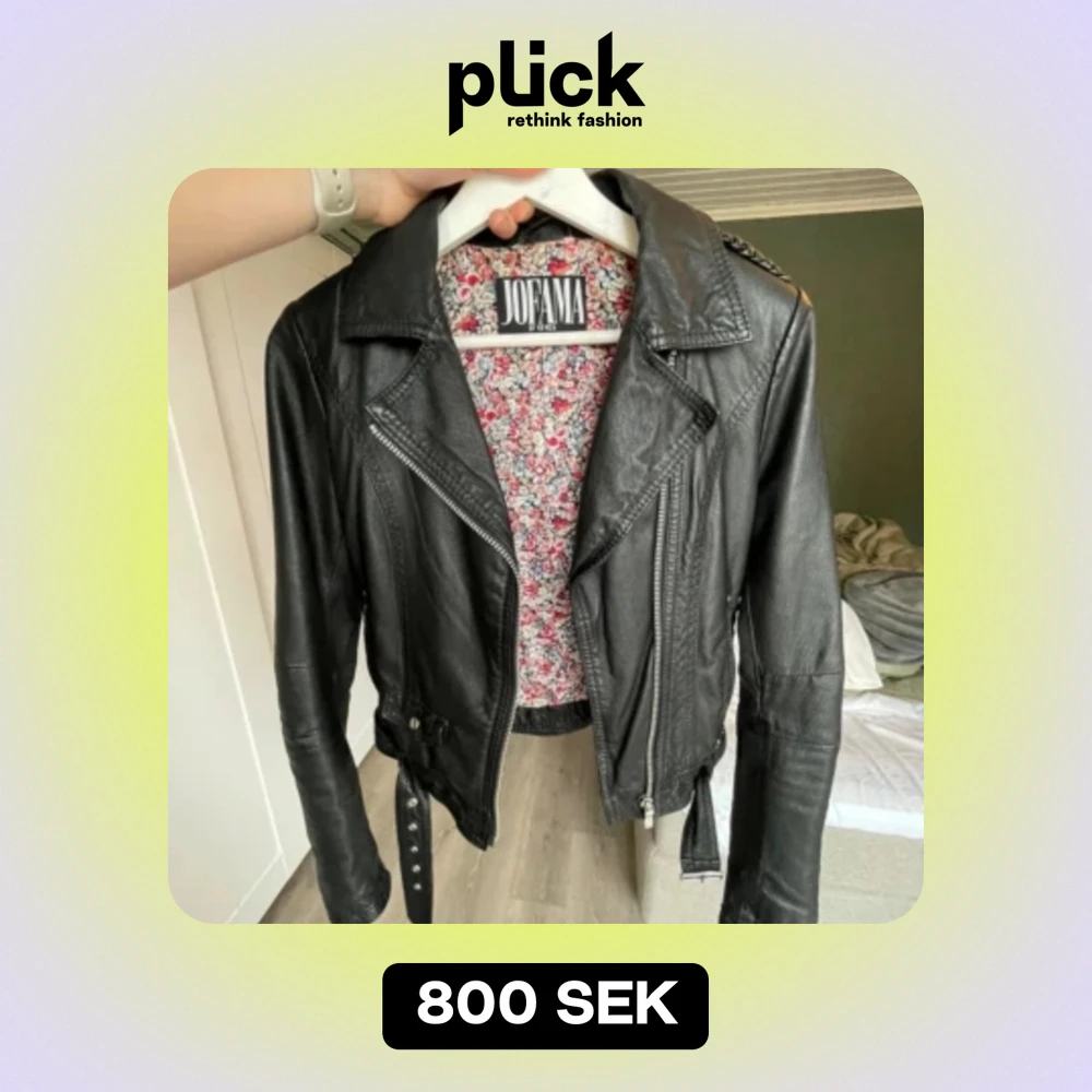 Svart skinnjacka i felfritt skick från Jofama by Kenza i storlek 34. Bikerstil med dragkedja och bälte i midjan. Nitar, dragkedja vid ärmslut, blommigt innerfoder.