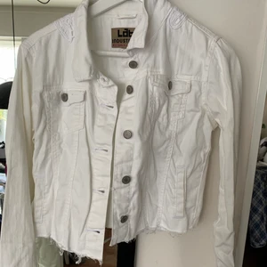 Vit jeansjacka med spetsdetaljer bak. Storlek S. Finns någon fläck jag inte försökt tagit bort.